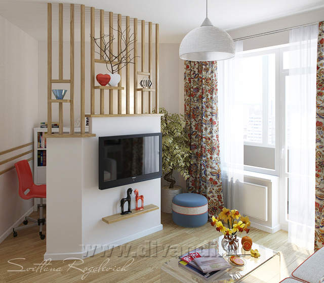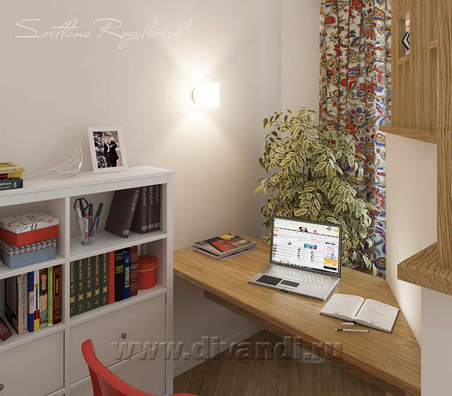 Планировочное решение при такой конфигурации комнаты родилось практически сразу – рабочий стол с невысоким стеллажом расположился за перегородкой в проблемном углу, что позволило удобно организовать зону отдыха. Трансформирующийся диван может использоваться в качестве спального места для гостей.