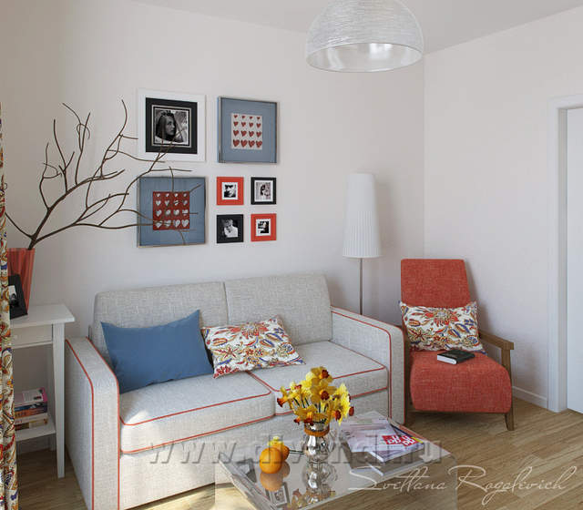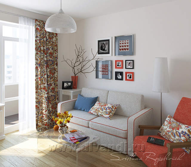 Ощущение легкости и простора в интерьере этой маленькой гостиной достигнуто за счет отсутствия массивной тяжелой мебели, а также использования белого цвета в отделке стен. Яркие акценты в виде декора на стене и пестрого текстиля наполняют красками и оживляют интерьер.