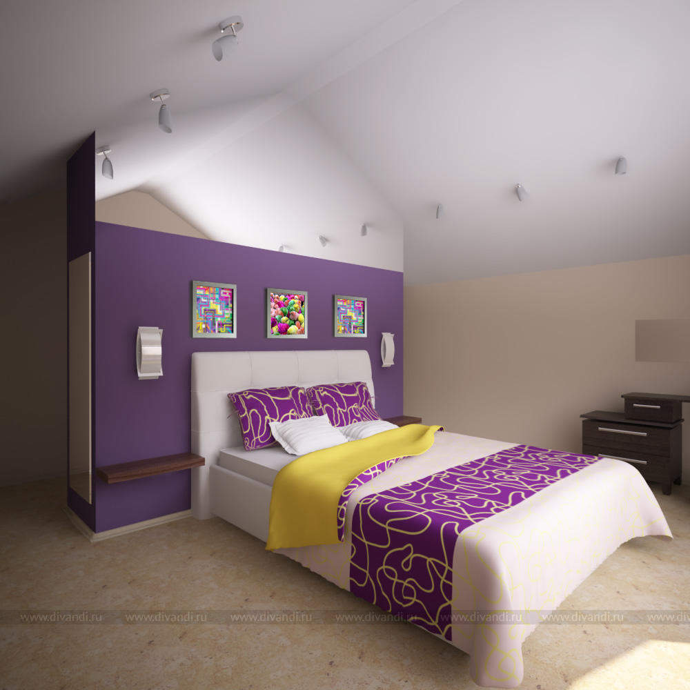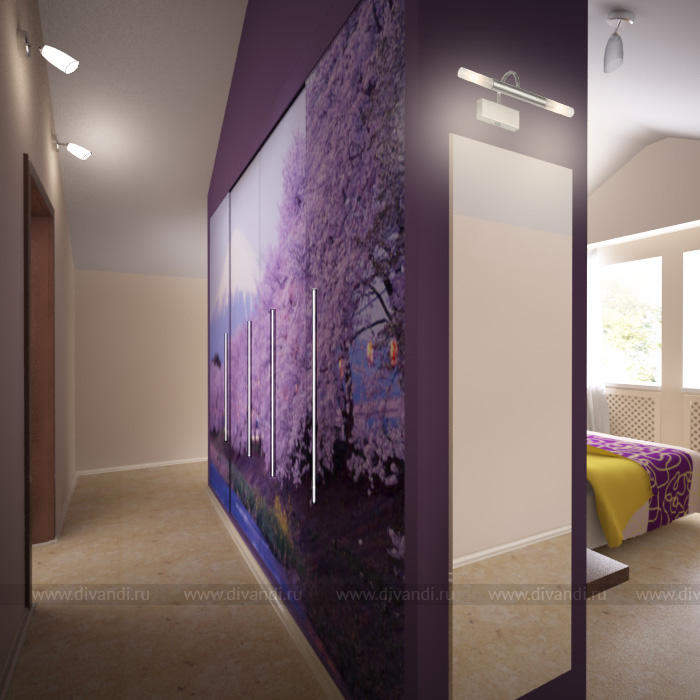 Спальня в коттедже условно разделена на 2 зоны: зону гардеробной и сна.