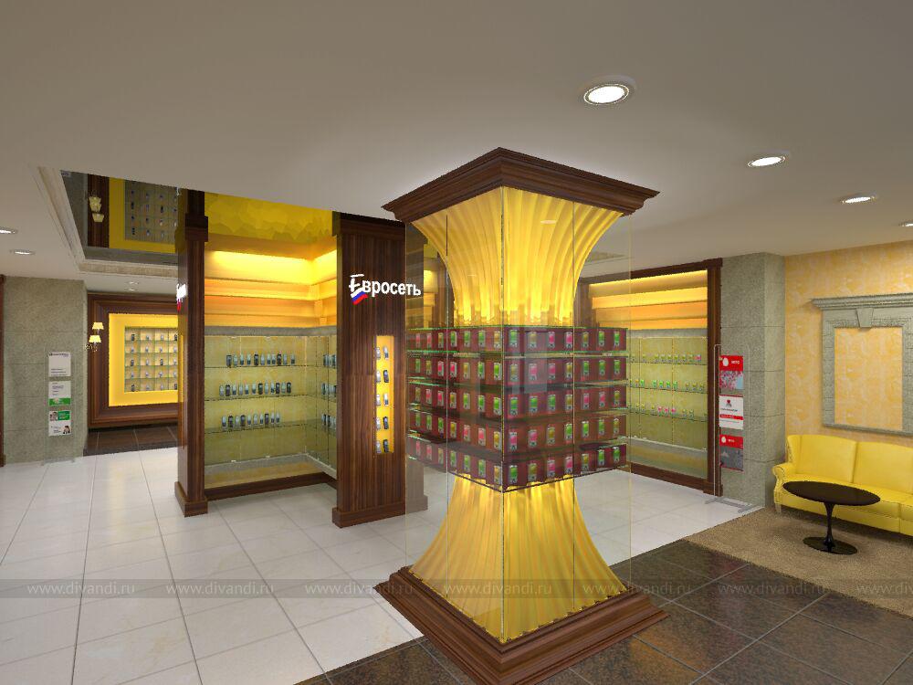 Интерьер VIP-салона Евросеть, для продажи премиальных телефонов. Сохранен фирменный желтый цвет, и он вписан в классический стиль.