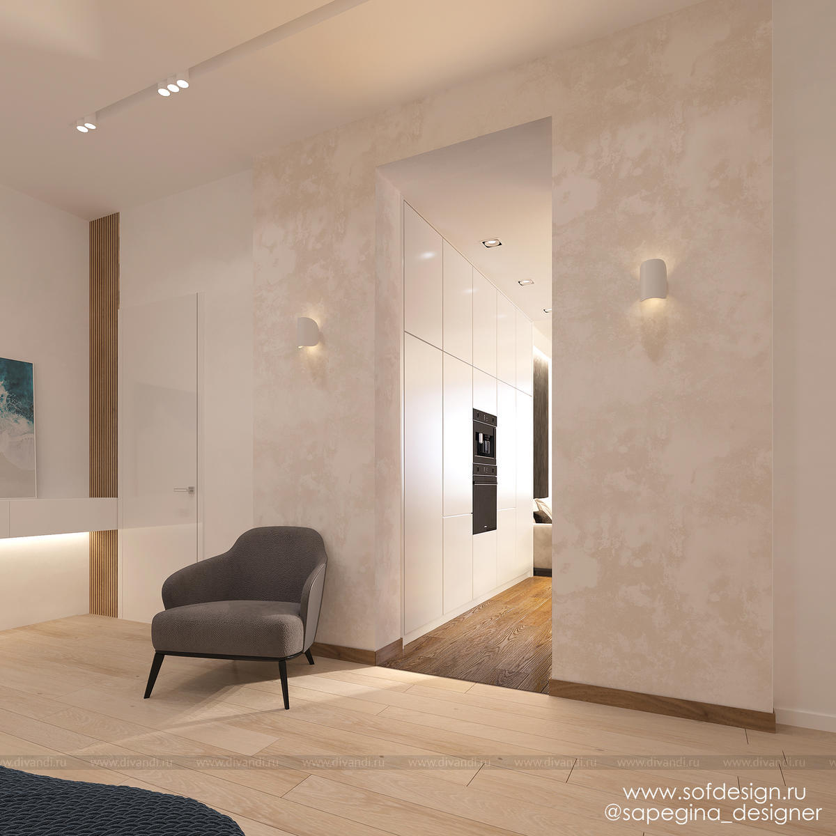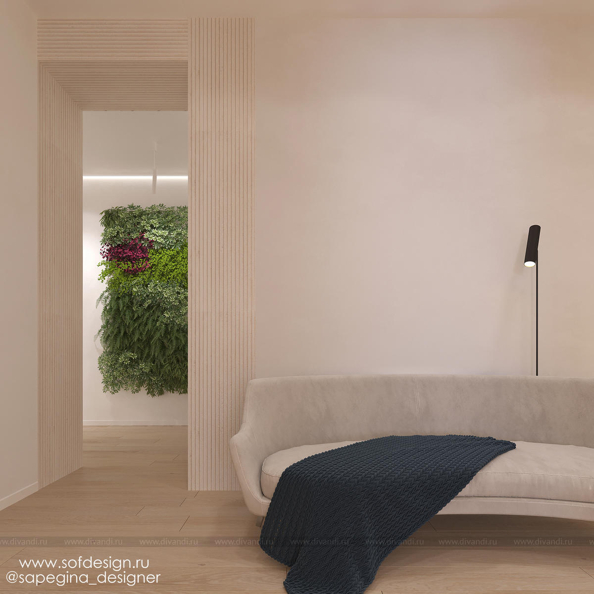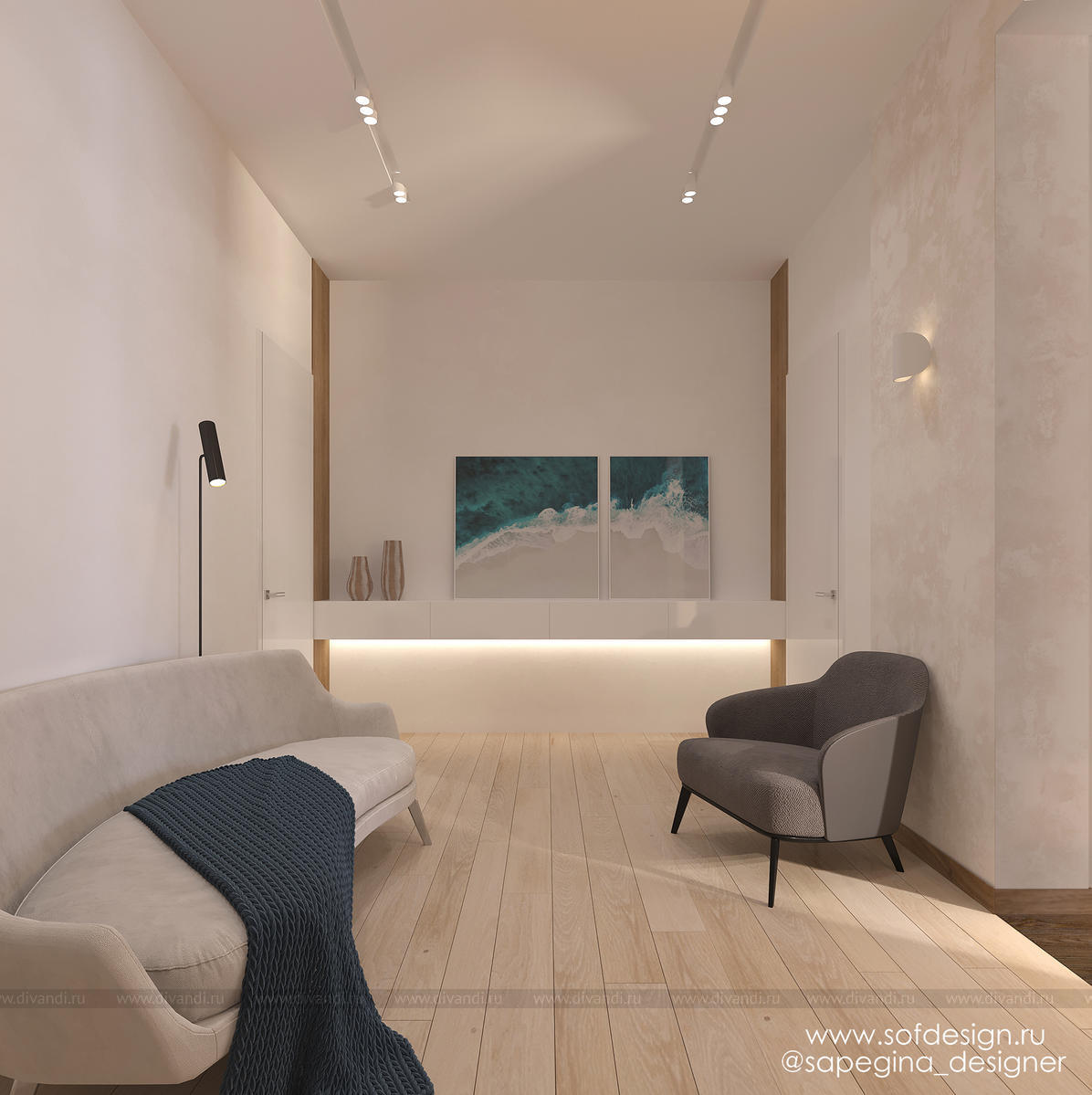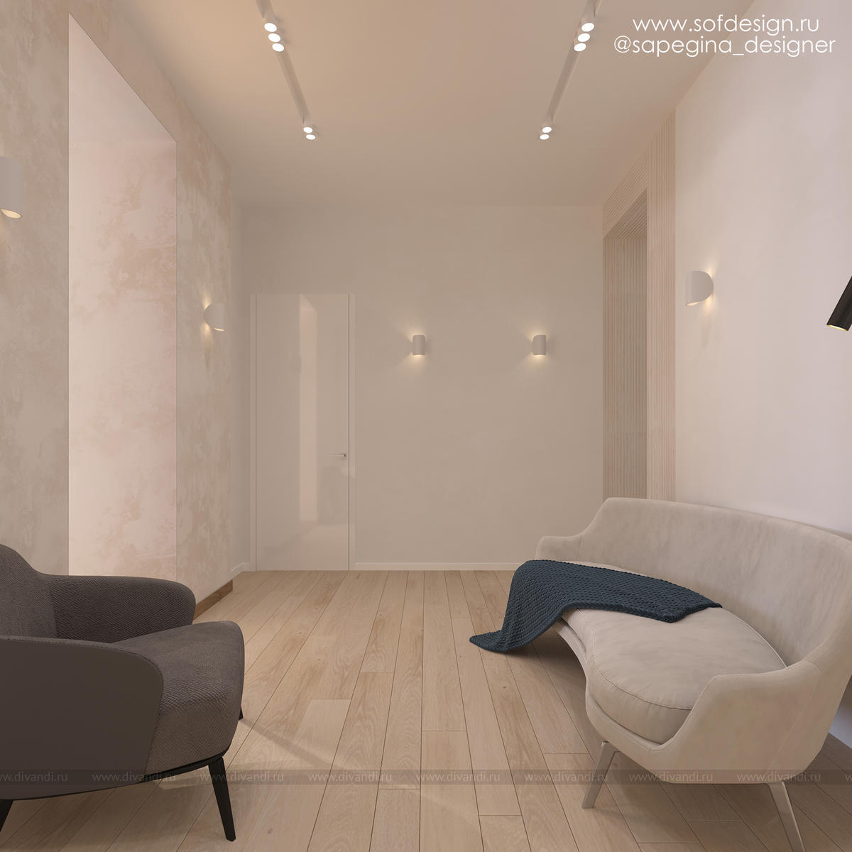 Интерьер холла. Светлый, нейтральный, т.к. нет естественного освещения, является фоном для гостиной, более насыщенной и контрастной.