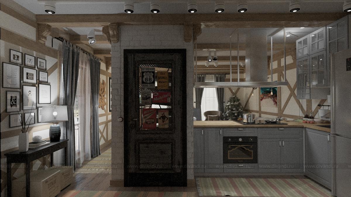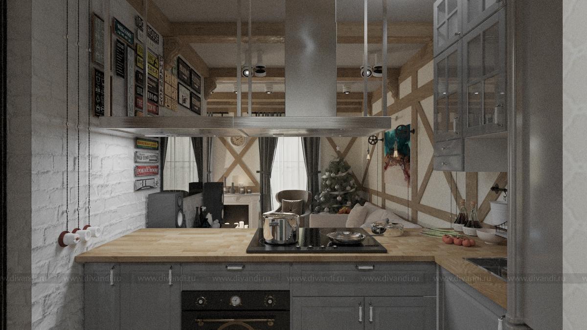 Тип проекта: загородный дом, кухня, гостиная