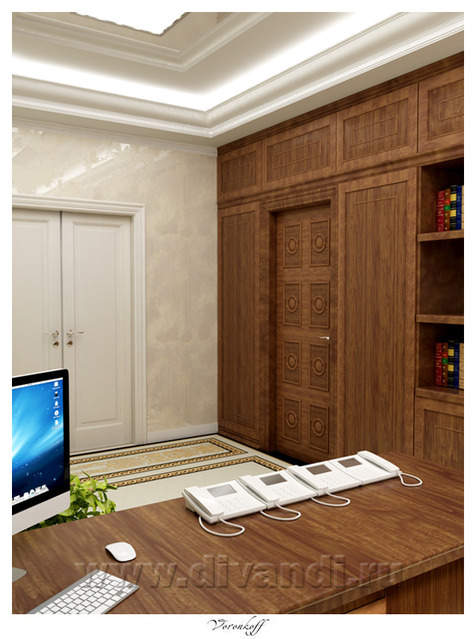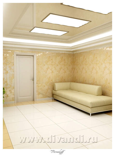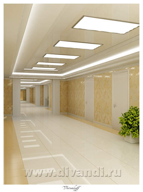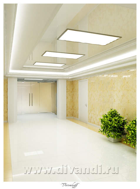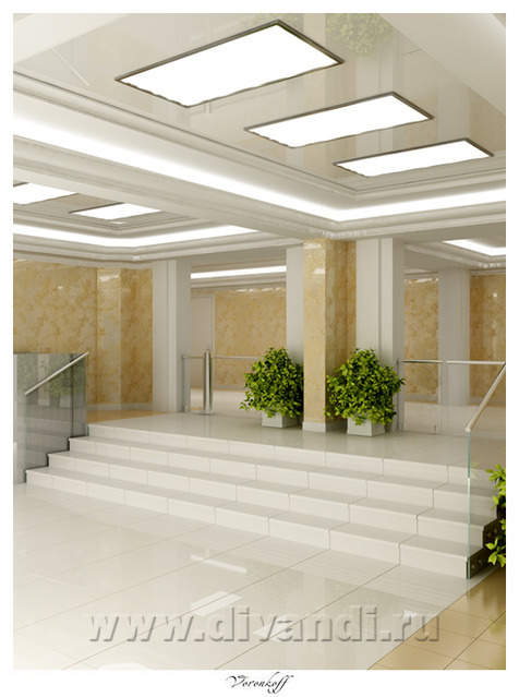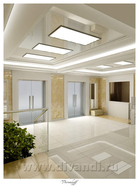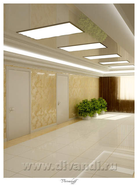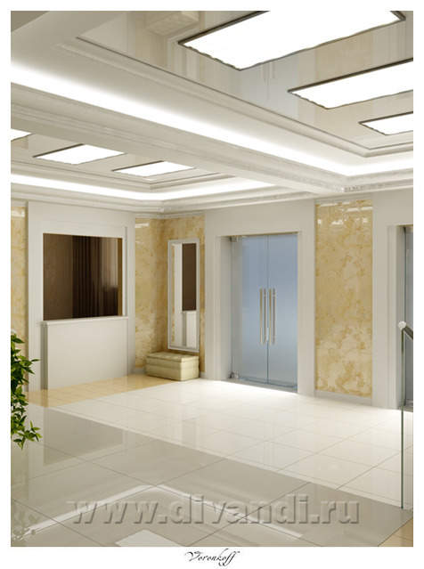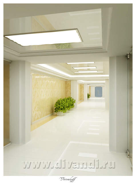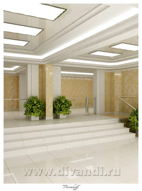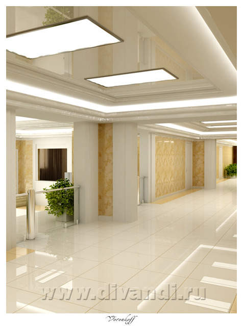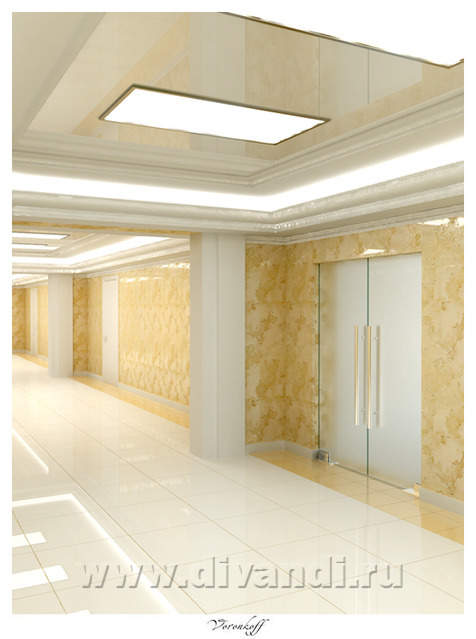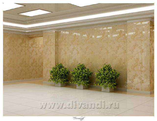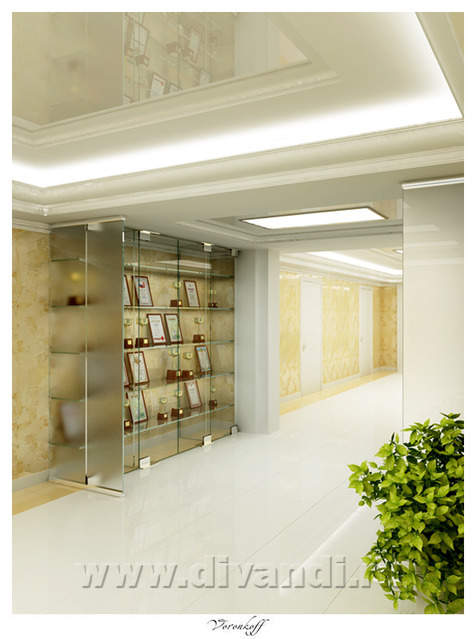 В качестве основного напольного материала в этом проекте используется полированный керамогранит белого цвета в сочетание с матовым керамогранитом бежевого цвета. В помещениях приемной и видео студии на полу лежат авторские ковры ручной работы Alexanders Collection.