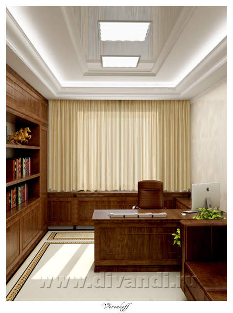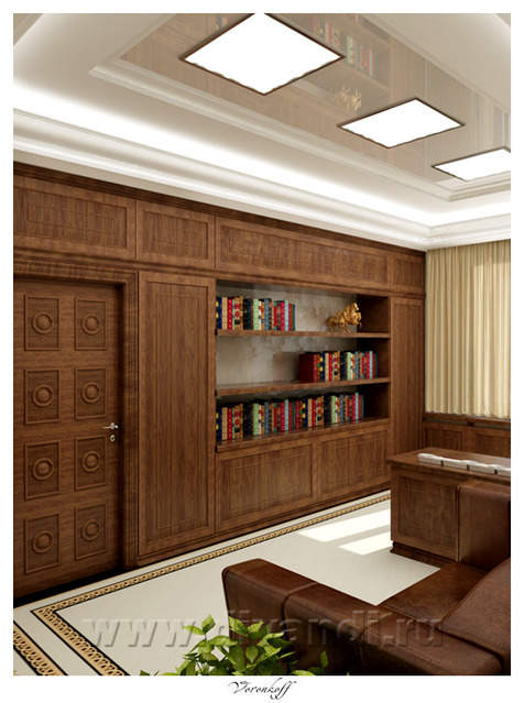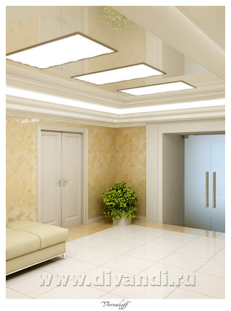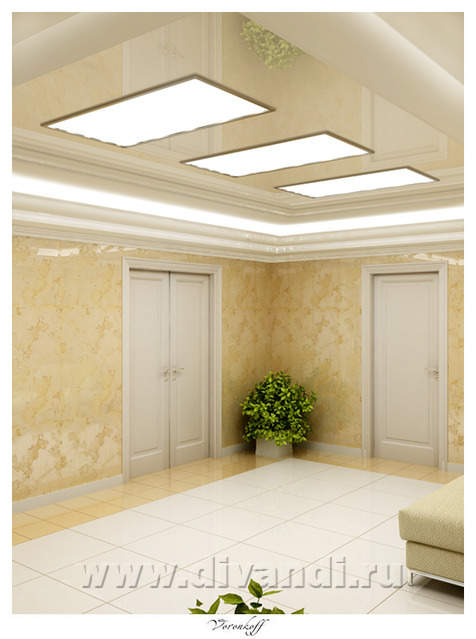 Особого внимание здесь заслуживает потолок, выполненный в классической манере с использованием фрагментов глянцевого натяжного потолка и отраженного света, благодаря этому удалось зрительно увеличить высоту помещений и в некоторой степени решить концептуальную задачу. Использование достаточно технологичных встроенных светильников с белым опаловым стеклом добавляют современности в интерьер.