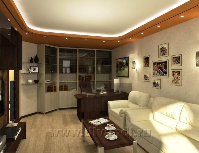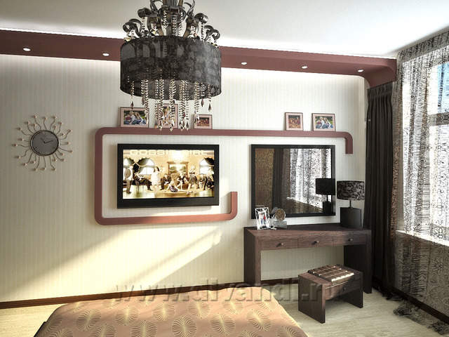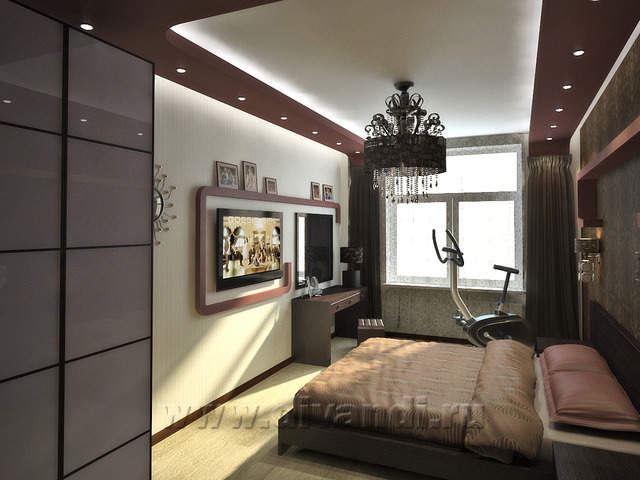 Единая концепция дизайна этого интерьера четко прослеживается во всех помещениях. Основную тему задает конструкция и контрастность потолка. Те же движения используются и на стеновых объектах. Интерьер выглядит очень устойчивым, гармоничным и уютным.