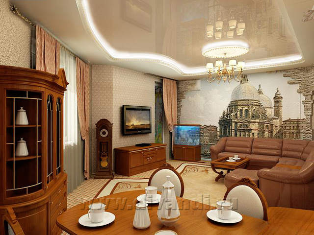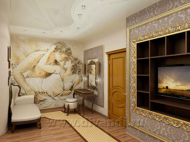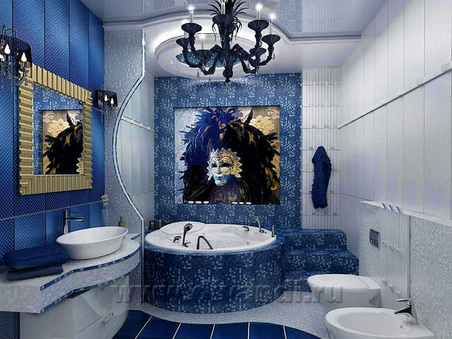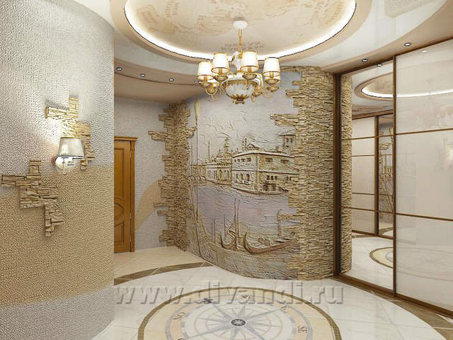 Проект выполнен с использованием фресок с видами Италии. В ванной специально на заказ художники сделали пано из мозайки с видом веницианской маски. Квартира получилась очень романтичная, пронизанная духом Италии.
