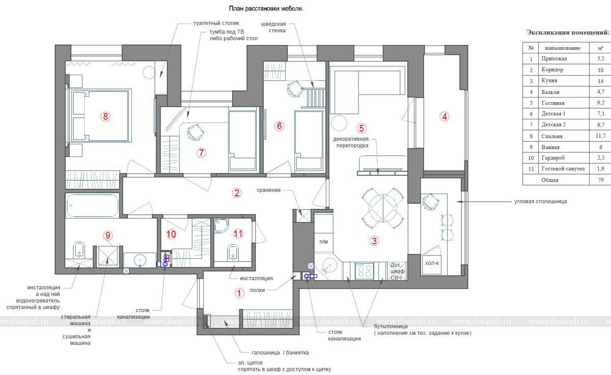 Качественный дизайн всегда начинается с хорошей планировки. В данном проекте заказчиками была поставлена задача увеличить количество комнат для того чтобы разделить детскую мальчика от детской девочки, что легко удалось сделать так-как как в квартире достаточное количество окон для комфортного разделения на 4 комнаты.