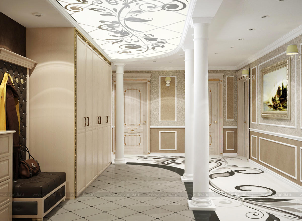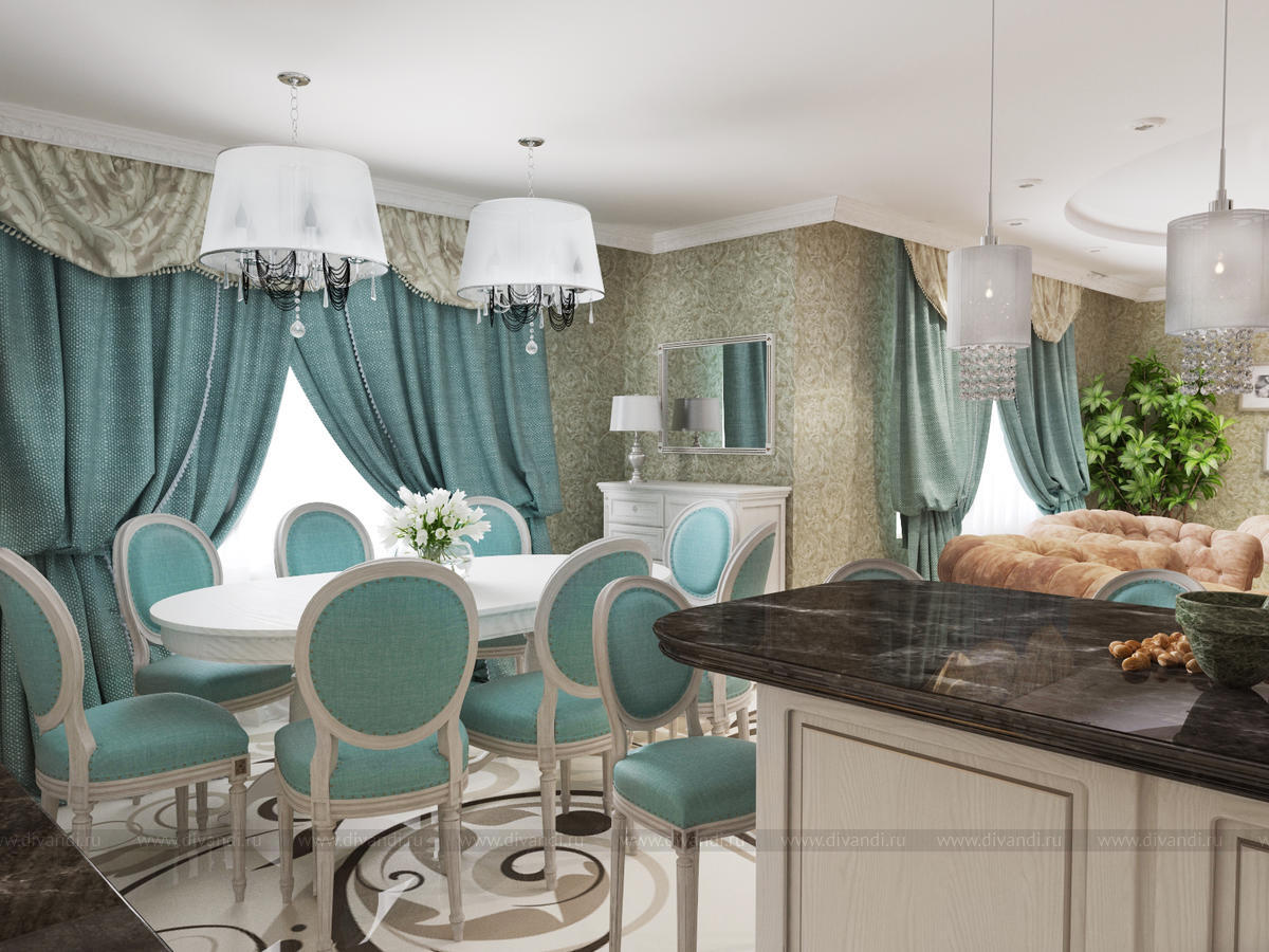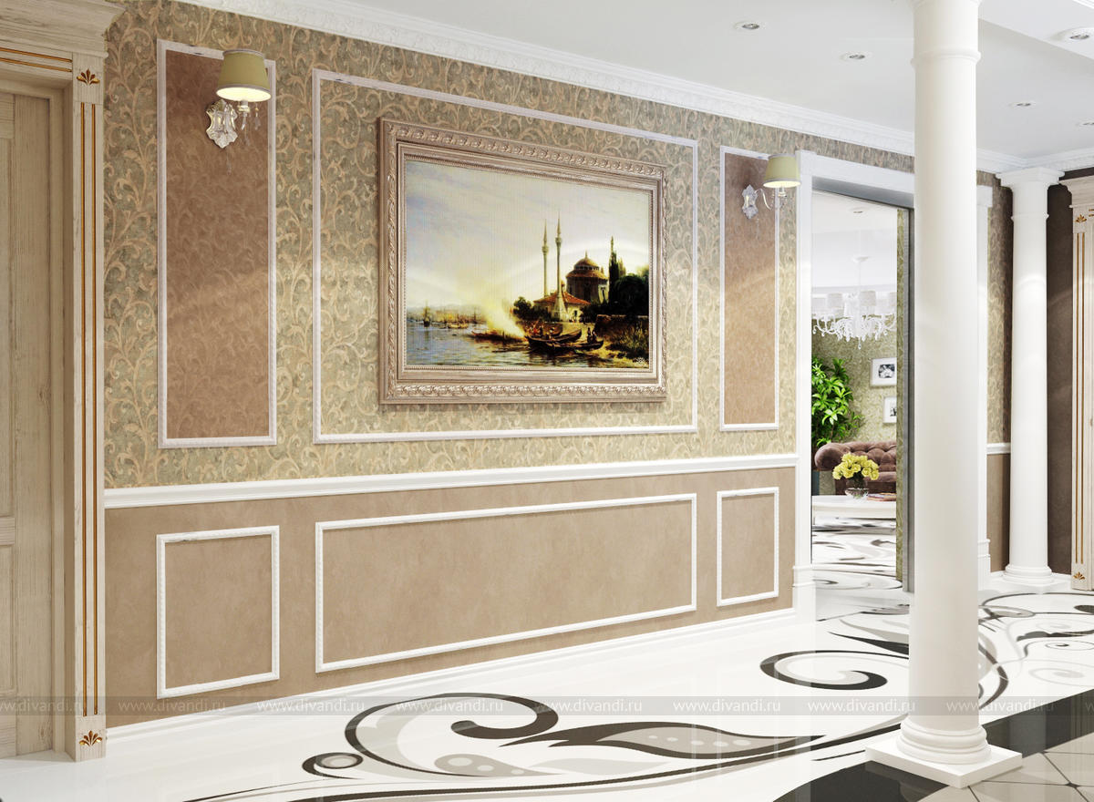 Заказчики-люди солидные, предпочитают классику, но полы требовались теплые, а керамика казалась грубовата... Наливные полы с изящным авторским рисунком, объединили пространство воедино, начиная с прихожей, плавно перетекли в гостиную, совмещенную с кухней-столовой.