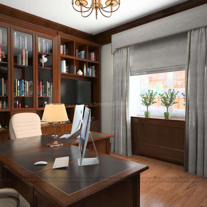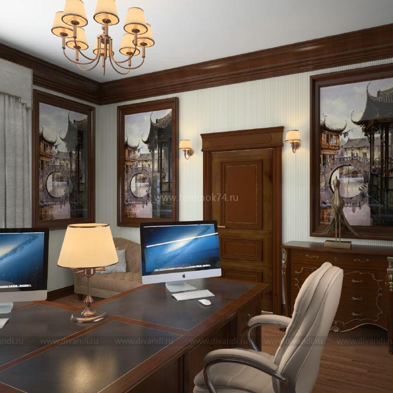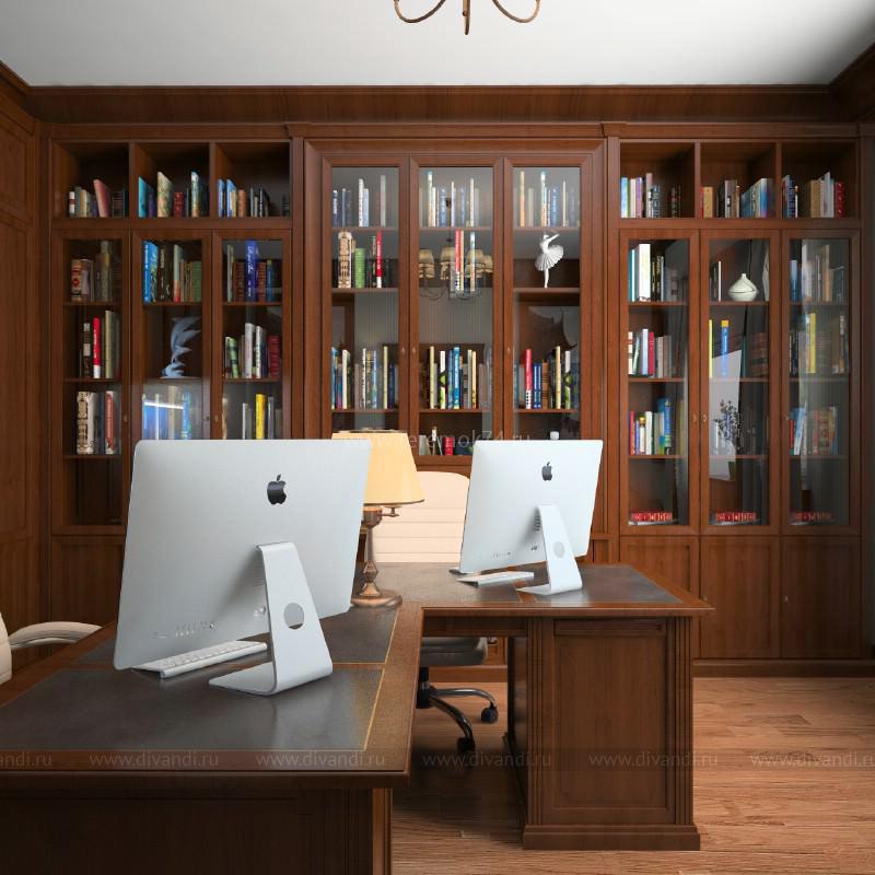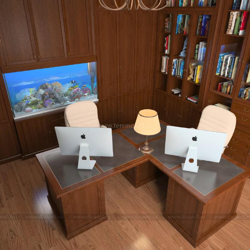 Польза рабочего кабинета в доме — это не просто дизайн и расстановка мебели. Это иллюстрация образа жизни. Классический стиль оформления, дерево с резными элементами два больших рабочих стола и удобная зона отдыха. Центральным композиционным элементом выступил большой аквариум, вписанный в систему хранения. Другая же его часть выходит в холл, что делает пространство более интересным и оживленным.
