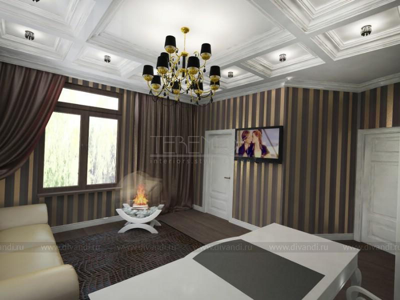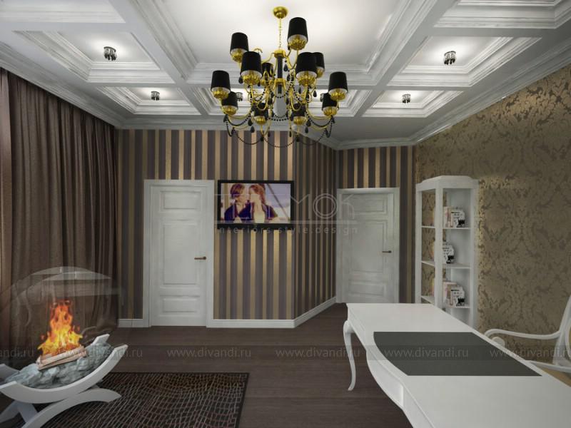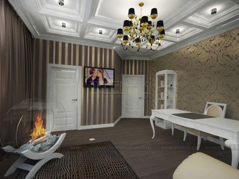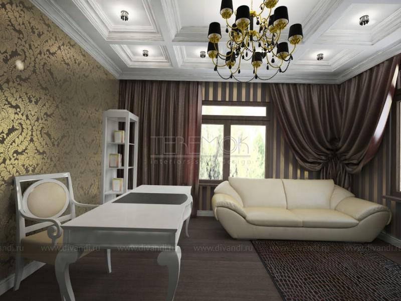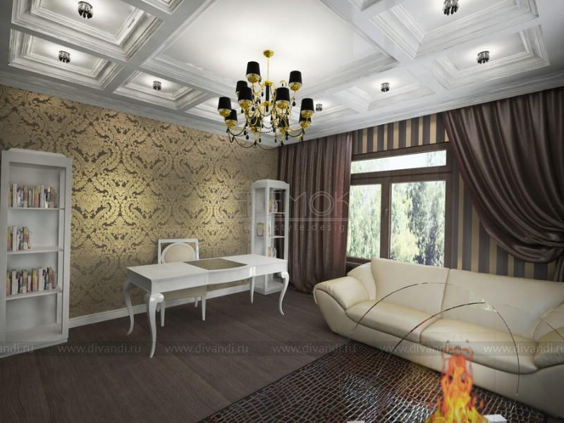 Кабинет ар деко. Строгое сочетание темных оттенков коричневого с золотым на стенах и светильнике создают атмосферу роскошного, богатого интерьера и настраивают на рабочую атмосферу, а если захочется передохнуть, то это можно сделать в зоне отдыха на уютном мягком светлом диване возле био камина, оформленного круглым стеклом. Нагруженность кессоновых потолков из лепнины, массивной люстры и темно-шоколадных штор придают интерьеру основательность и подчеркивает индивидуальность хозяина.