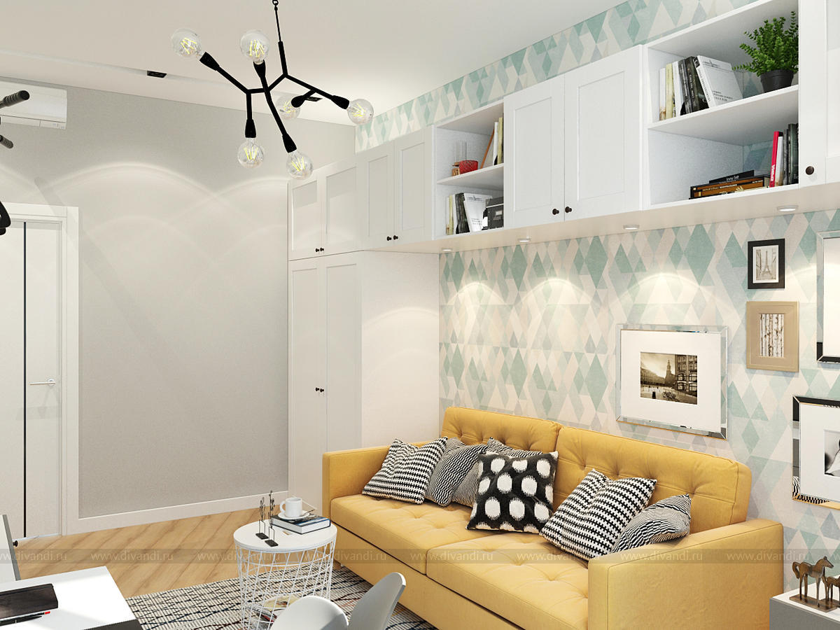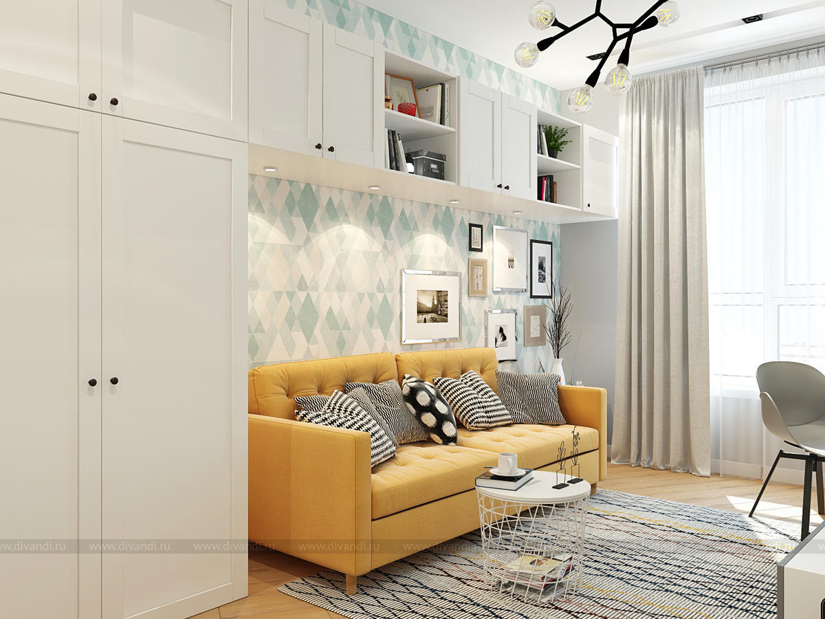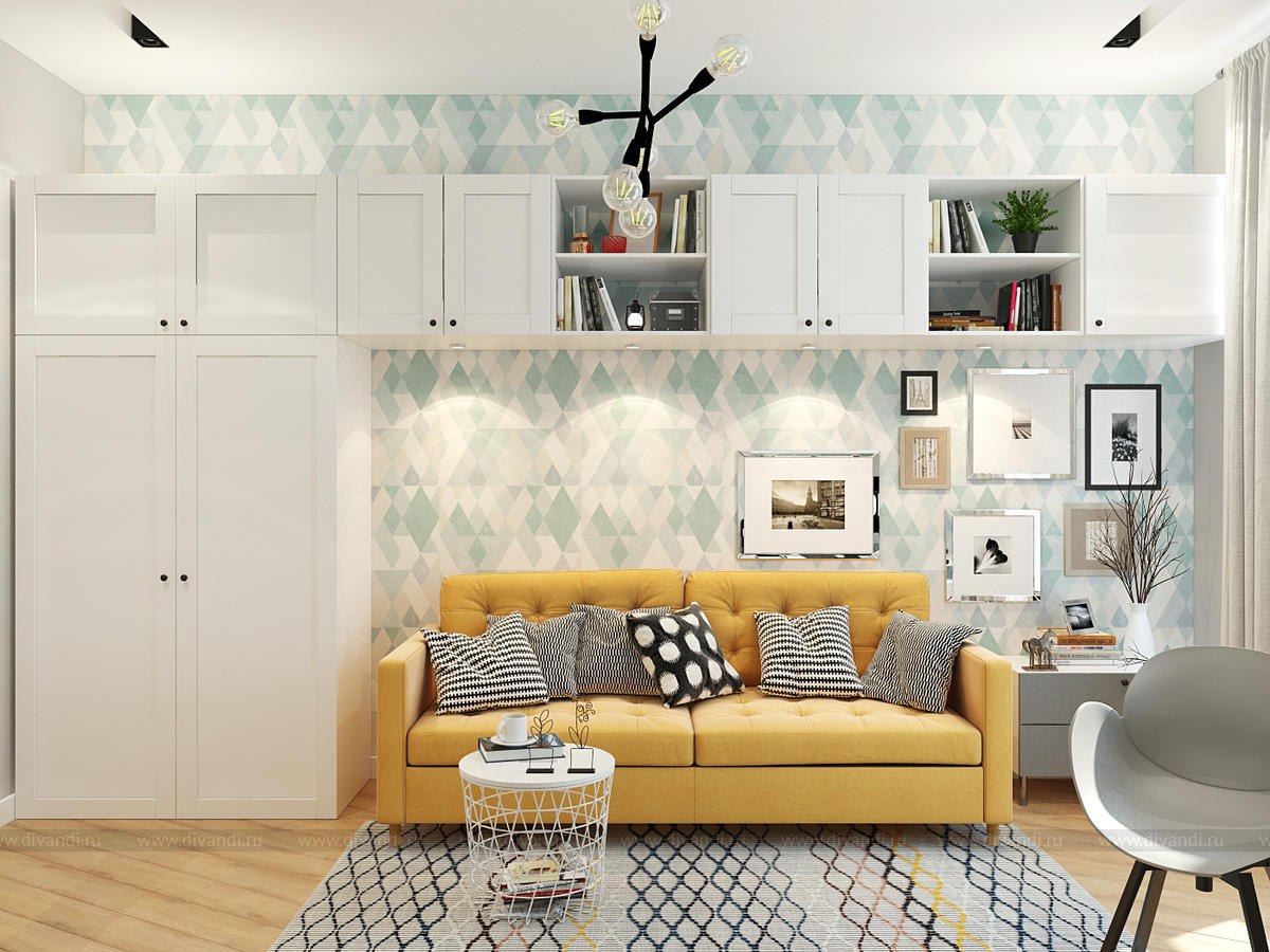 Сочетание холодных голубых и серых оттенков отлично оттеняет яркий цвет дивана. Навесные шкафы в светлом цвете, благодаря подсветки не утяжеляют комнату, но служат дополнительными местами хранения, которых всегда мало.
