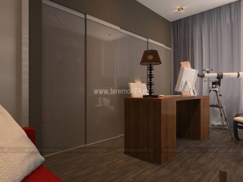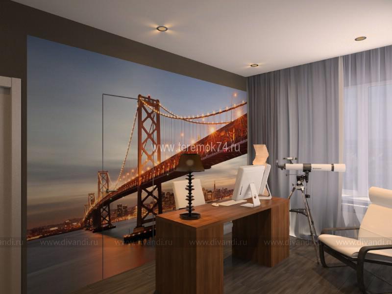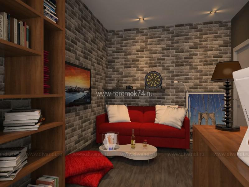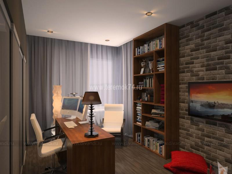 Кабинет выполнен в американском духе, это преимущество теплая цветовая гамма, и наличие кирпичной стены. Именно в этой комнате, возможно, продолжить рабочий день в не стен офиса, а также просто расслабиться после изнурительно дня на диване с включенным био-камином. В этой комнате панорамные окна от пола до потолка, что позволило нам поставить телескоп и удобное кресло, чтобы любоваться пейзажем ночного неба.