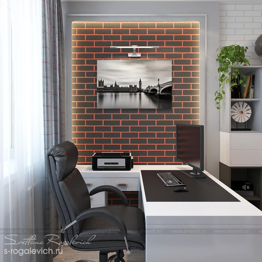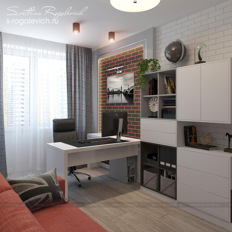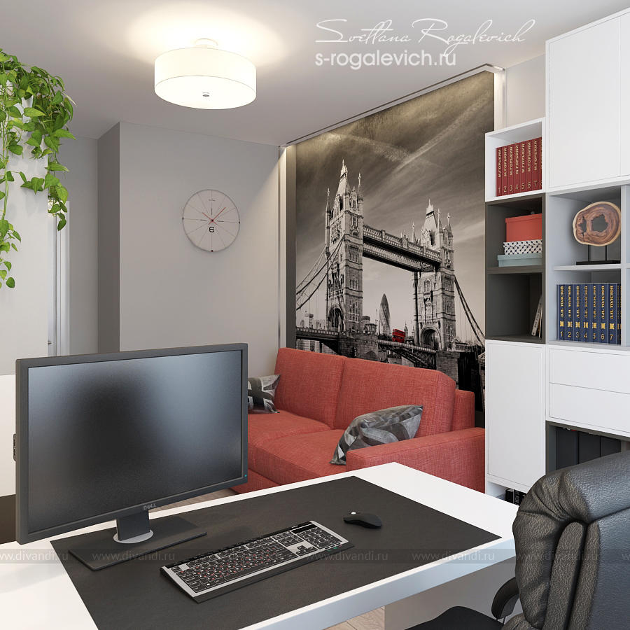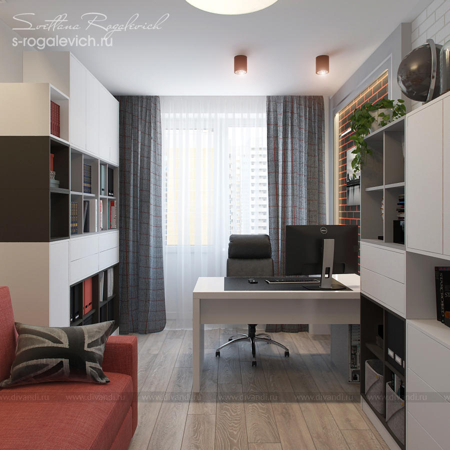 Интерьер помещения выполнен в преобладающей бело-серой гамме с включением ярких красных акцентов, что делает его графичным и нескучным.