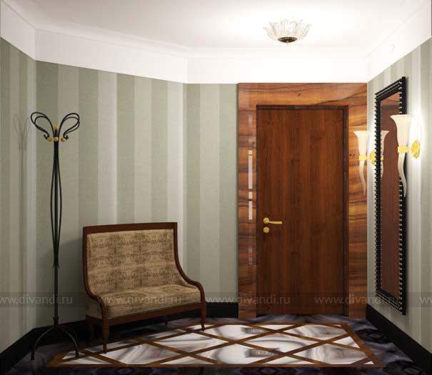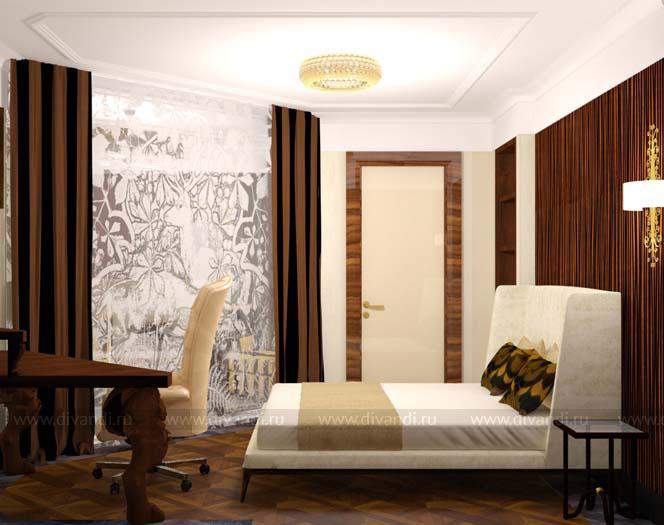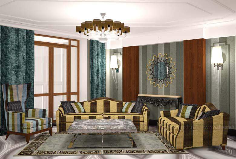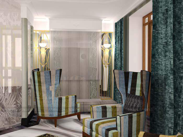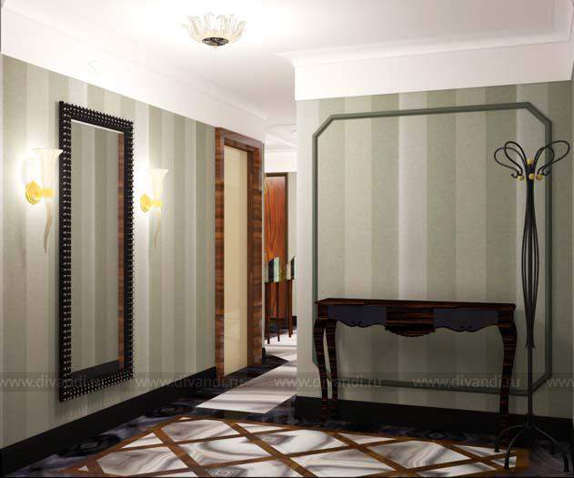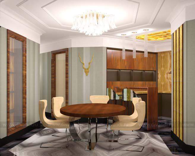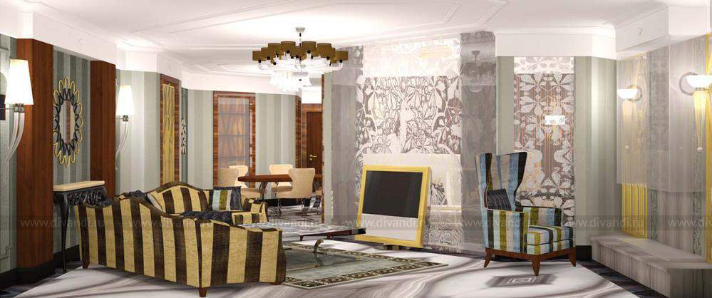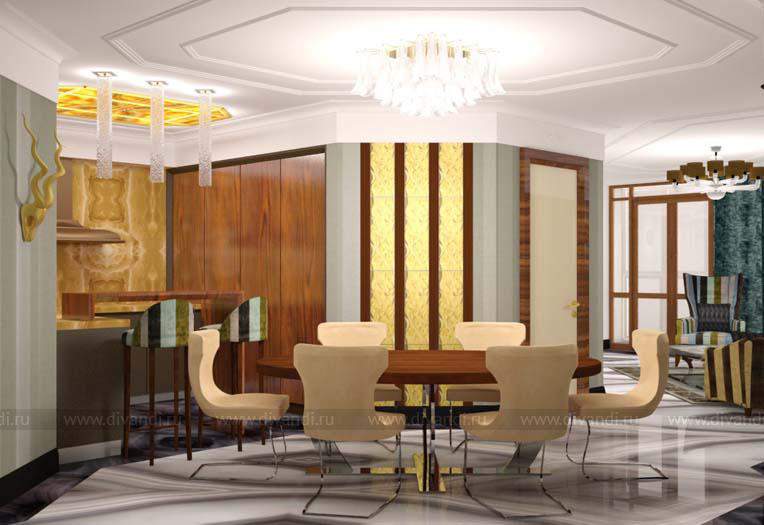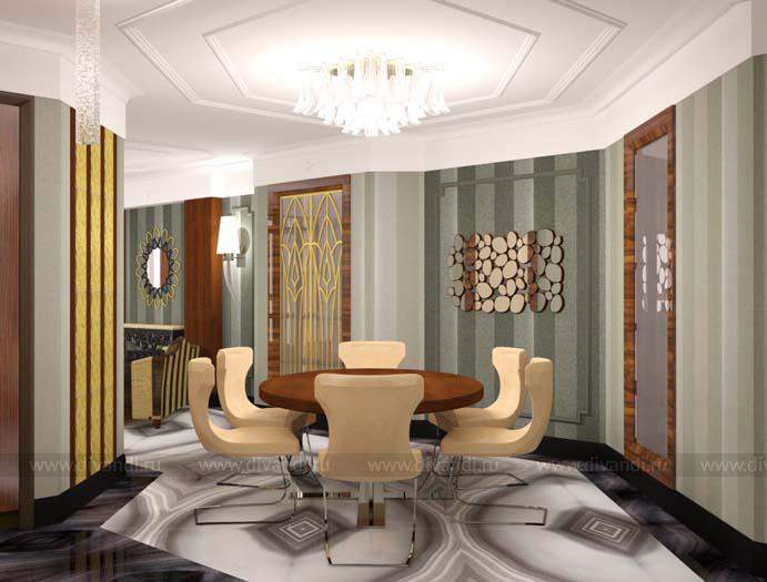 Сложная архитектура пространства связана не столько с выбором невероятно роскошного и сложного стиля Ар Деко, сколько с исходными характеристиками объекта. Пространство организовано сложной геометрической сеткой, выверенной до миллиметра, и, раскрываясь сразу от входа, ведет нас к парадным зонам - большой столовой на 8 персон, развернутой под 45 градусов и подчеркивающей динамику, и просторной гостиной с каминной зоной.