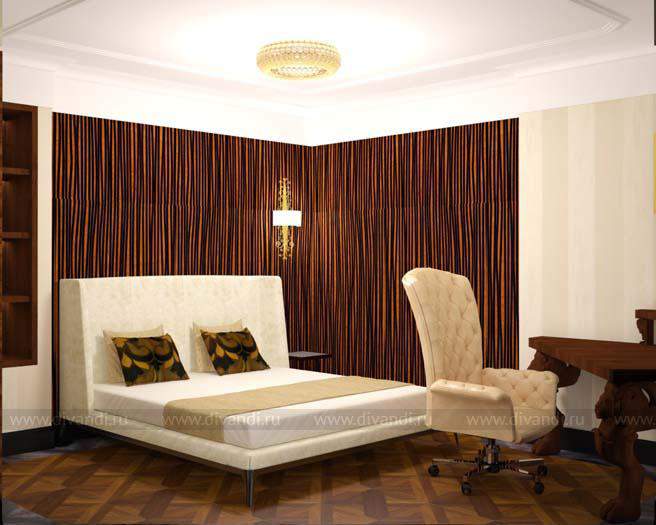 На такой небольшой площади расположились не только парадные зоны, но и все необходимые для комфортной жизни помещения: спальня с большой кроватью и рабочим столом, выполненным по авторским эскизам из дуба, естественное освещение которой обеспечивается большой стекленной перегородкой и дополнительным "окном" в рабочей зоне, выполненными в стиле интерьера, большая гардеробная с гладильной доской, отдельные зоны для гостевого санузла и хозяйской ванной с туалетным столиком и личной раковиной на авторском подстолье, а также небольшая постирочная.