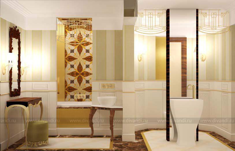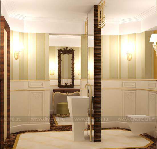 Основой интерьера послужили акценты на уникальных материалах в их сложных сочетаниях: шпон палисандра в лаке на фасадах кухни от Julia Novars и дверях от New Design Porte, новинки итальянской фабрики Rex - крупноформатный керамогранит Alabastri di Rex, имитирующий большие пласты мрамора невероятной красоты, рисунок которых подобран фабрикой с особой тщательностью, искусственный камень оттенка темного шоколада с крупными золотыми вкраплениями, зеркала и остекление больших форматом с рисунками, разработанными специально для данного интерьера.
