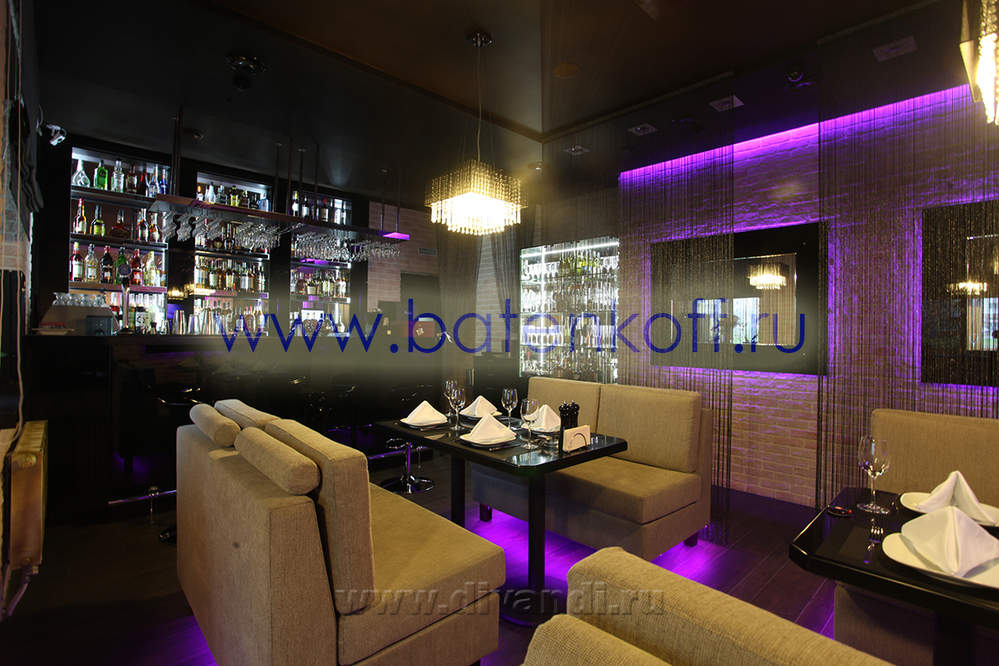 По потолку струится дым. Он начинается при входе в кафе и заканчивается возле барной стойки, пронизывая все кафе. Он нарисован на потолке с помощью флюорисцентных красок, что придает неповторимый стиль данному интерьеру.