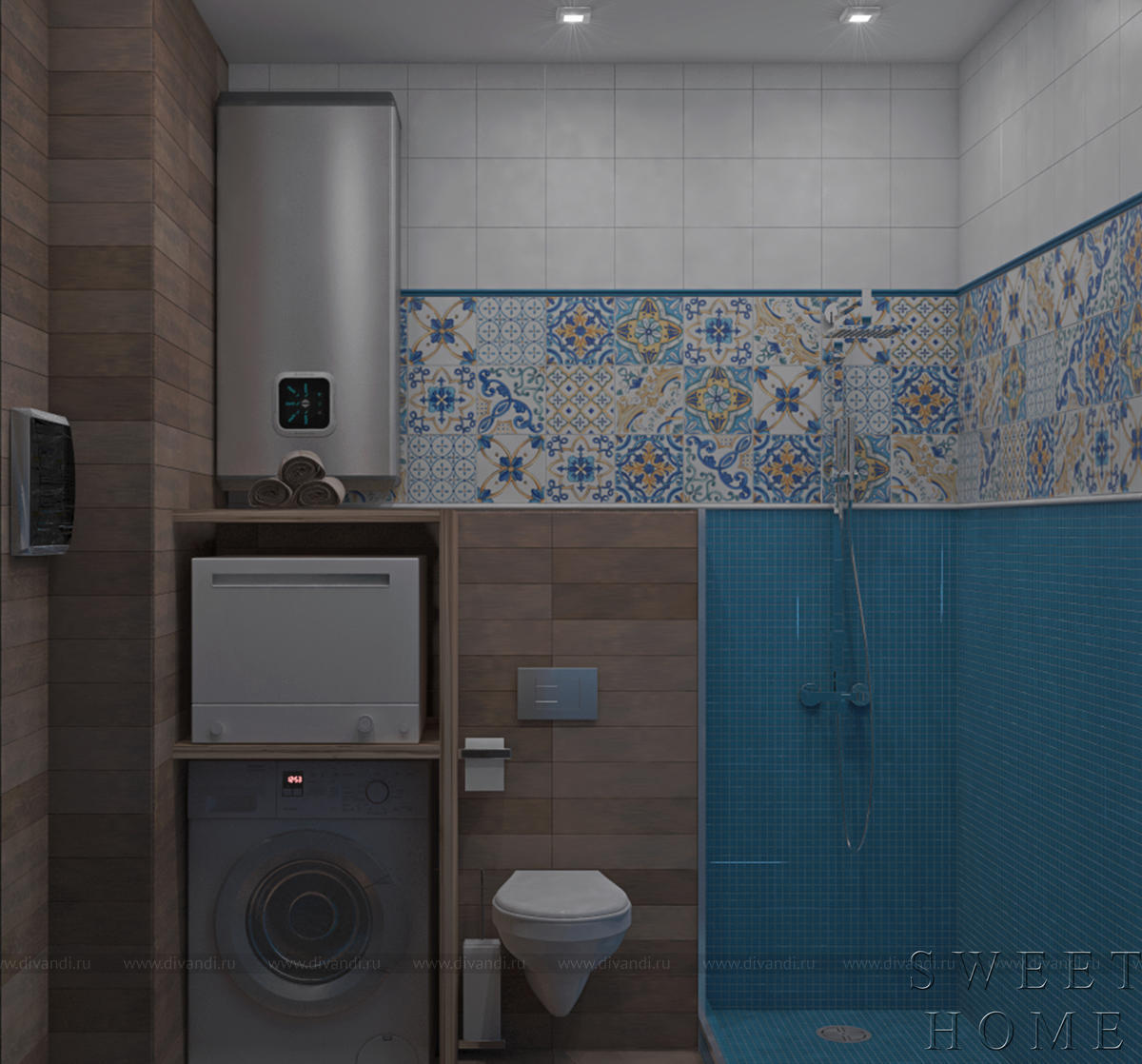 Декор — плитка пэчворк. Данная плитка сочетается практически со всем. Но очень хорошо подходит дерево. Из-за этого было принято решение о облицовки плитки под дерево следующих поверхностей: короб под инсталляцию, пол и две небольших стены.