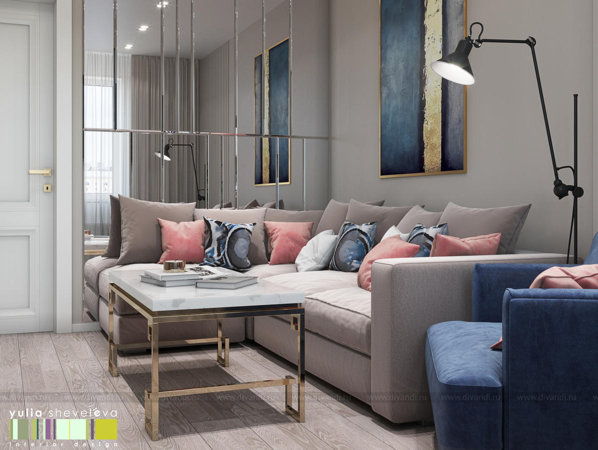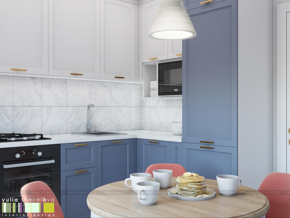 Проект получил название «Карамель и лед», так как во всех комнатах переплетаются теплые и холодные цветовые оттенки. Глубокий синий оттенок легкой нитью проходит через весь интерьер в мебели, отделке стен и декоре.