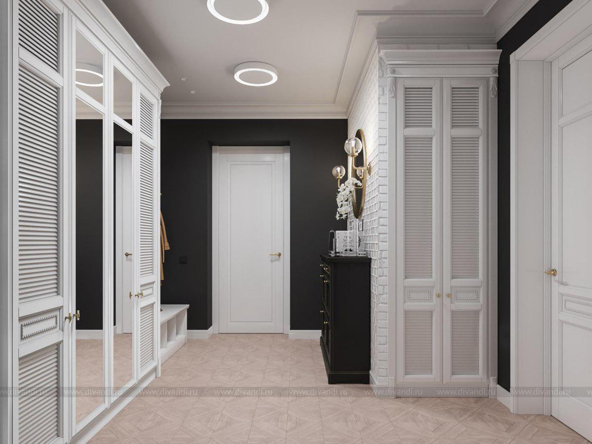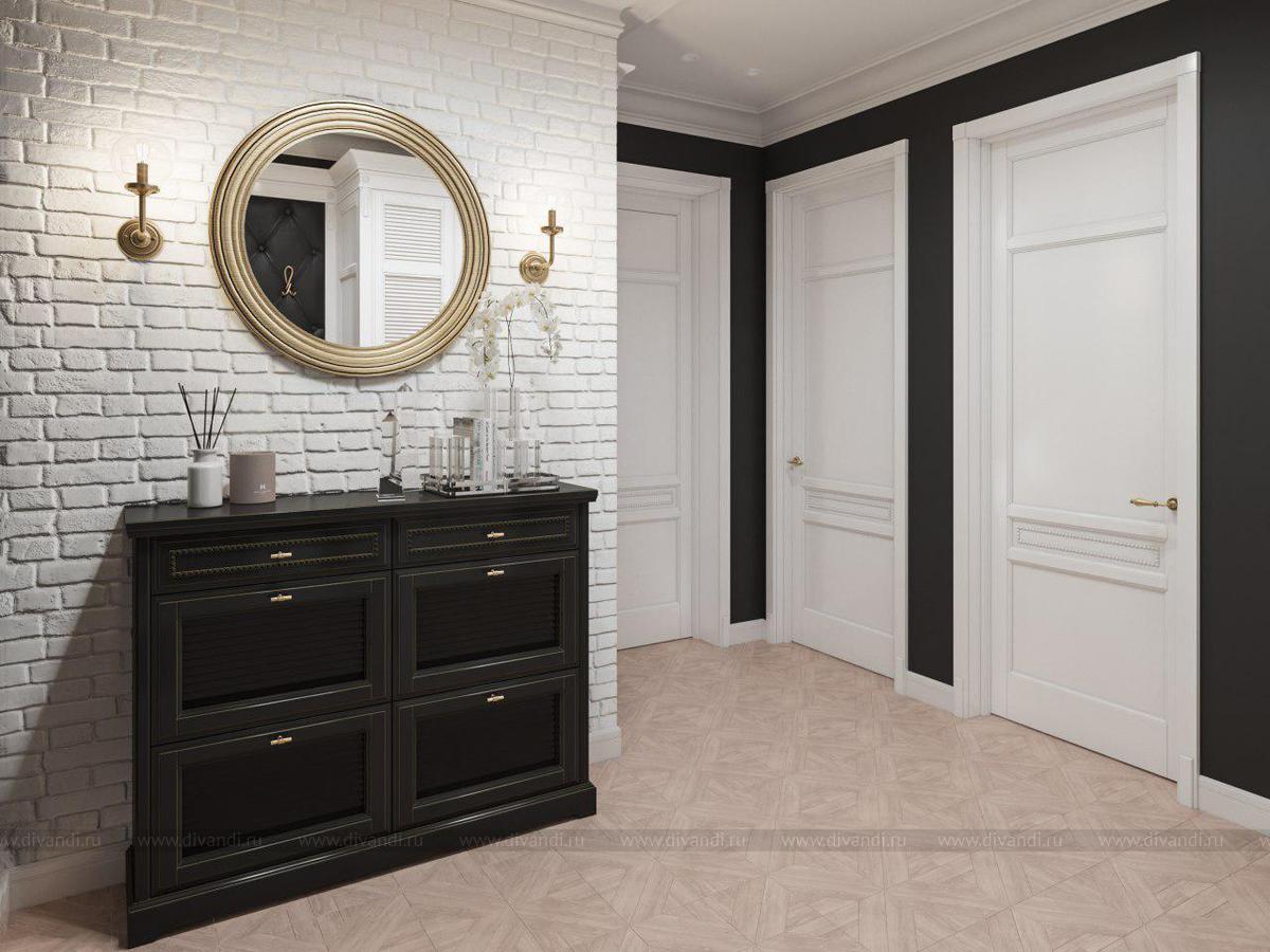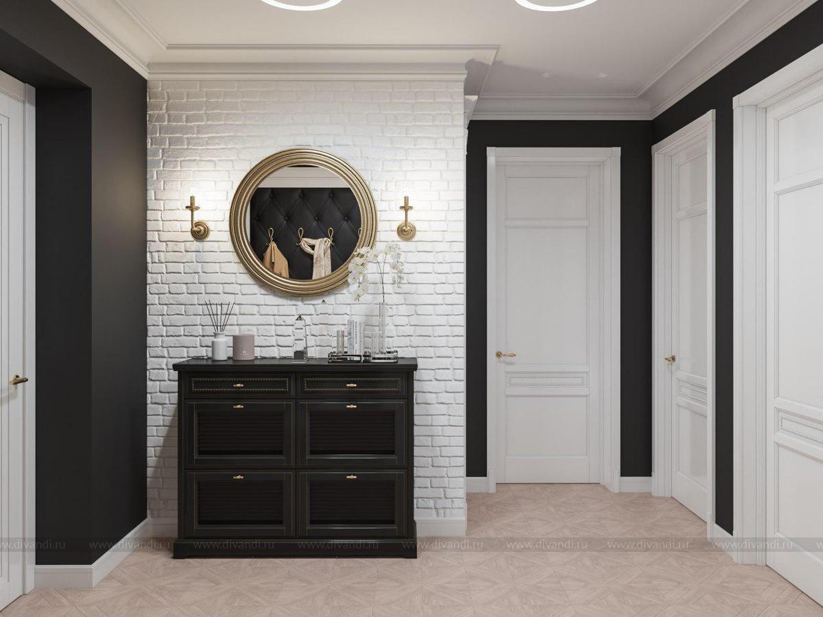 Прихожая решена достаточно контрастно с применением "состаренного" кирпича. В соавторстве с Юрием Бельмесовым для "Александр Тишлер"