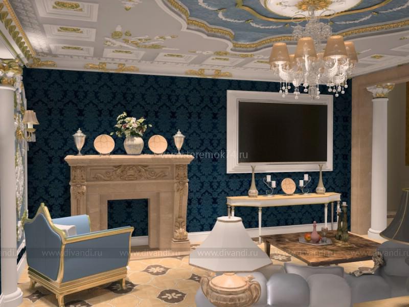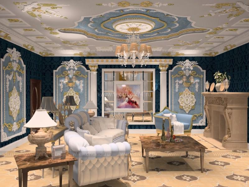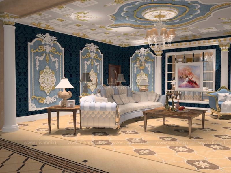 Как и подобает дворцовым интерьерам, ставка в дизайне проекта сделана на индивидуальные изделия, выполненные по авторским чертежам и эскизам, и дорогие материалы с богатыми фактурами. Такие как текстильные обои с вышивкой или же гипсовая лепнина на стенах, изготовленная скульптором по эскизу, художественный паркет с цветочным рисунком или потолок с разнообразными розетками, карнизами, кессонами и молдингами. Важную роль играют аксессуары, они завершают образ классического дворцового интерьера.