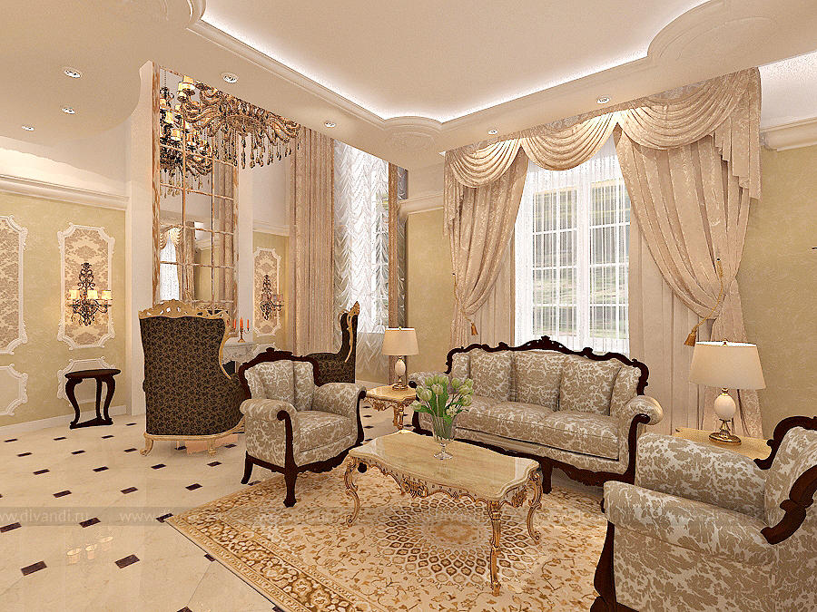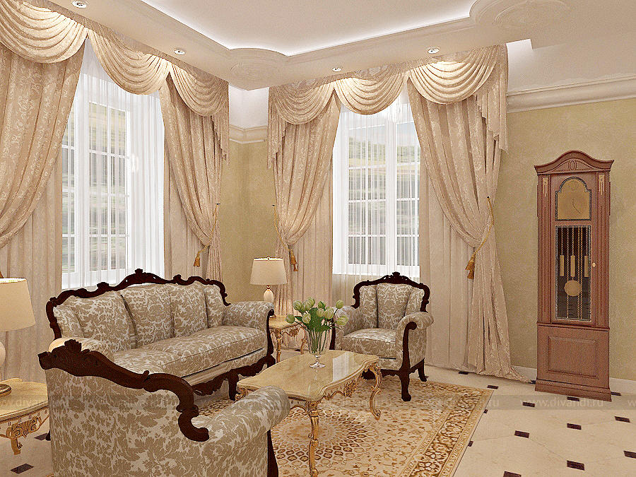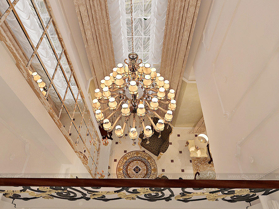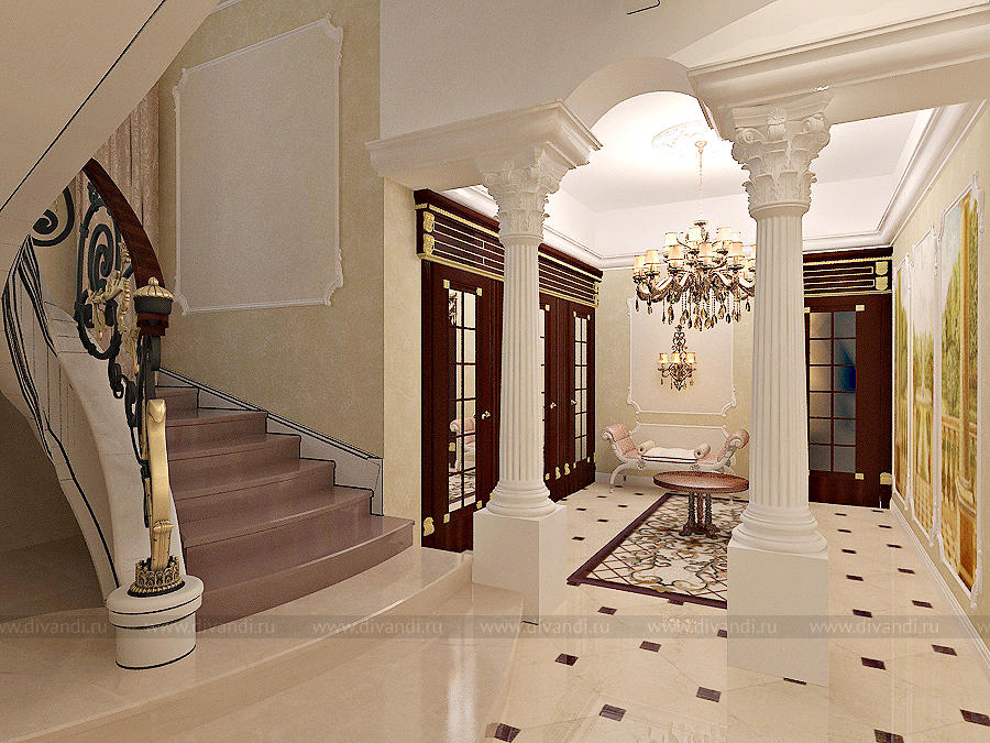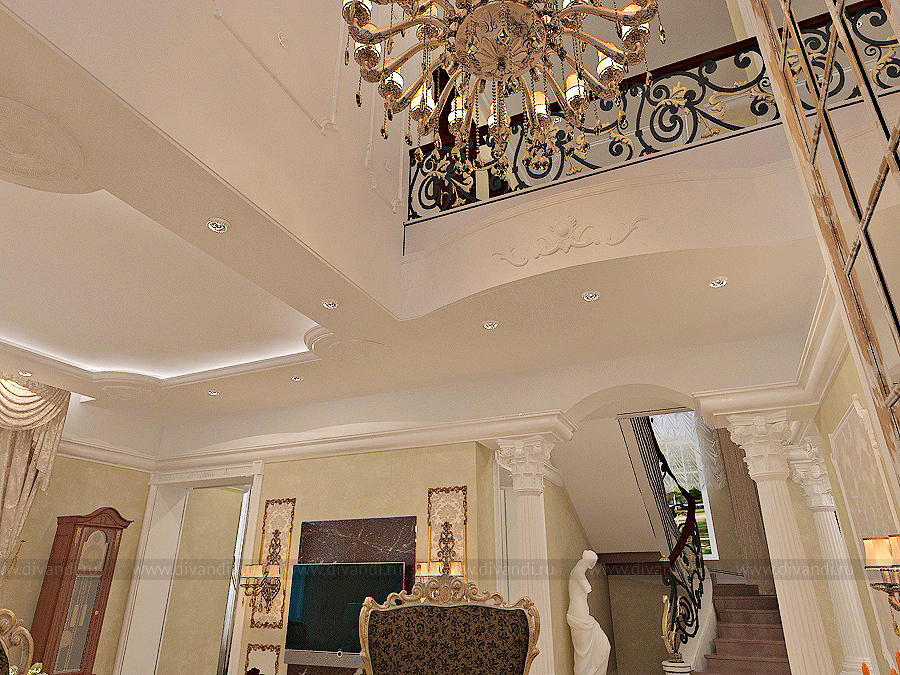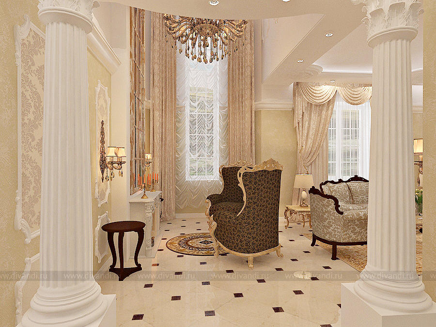 Отправной точкой этого проекта стал внешний облик здания. В архитектурном проекте фасада было много лепных элементов. Самый помпезный из них – скульптуры львов перед центральным входом. Заказчики пожелали создать интерьер в классическом стиле, который был бы мягкий, спокойный, комфортный, ненавязчивый для размеренной загородной жизни.