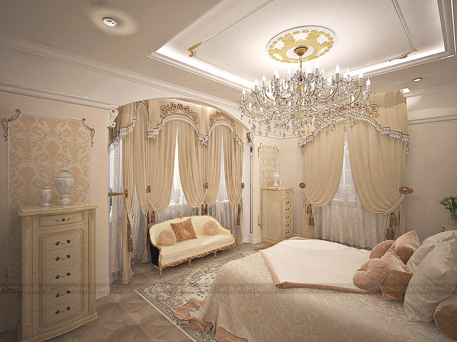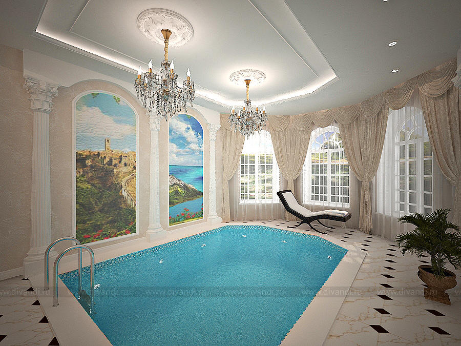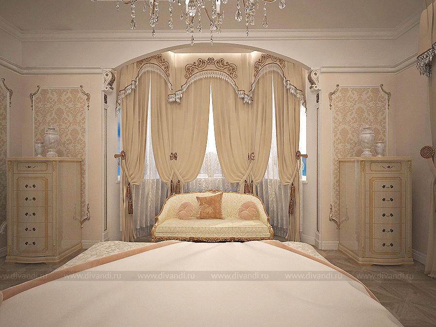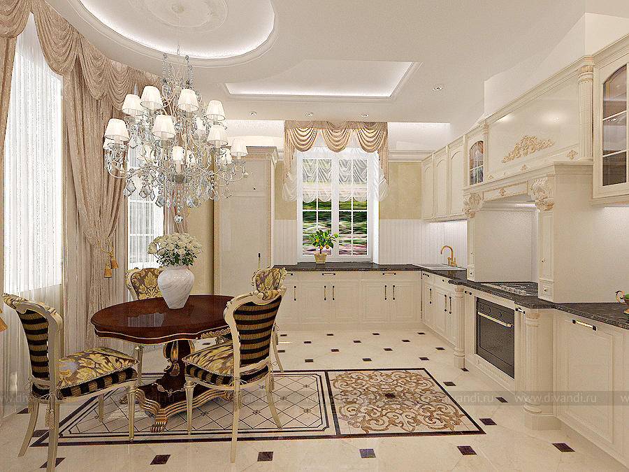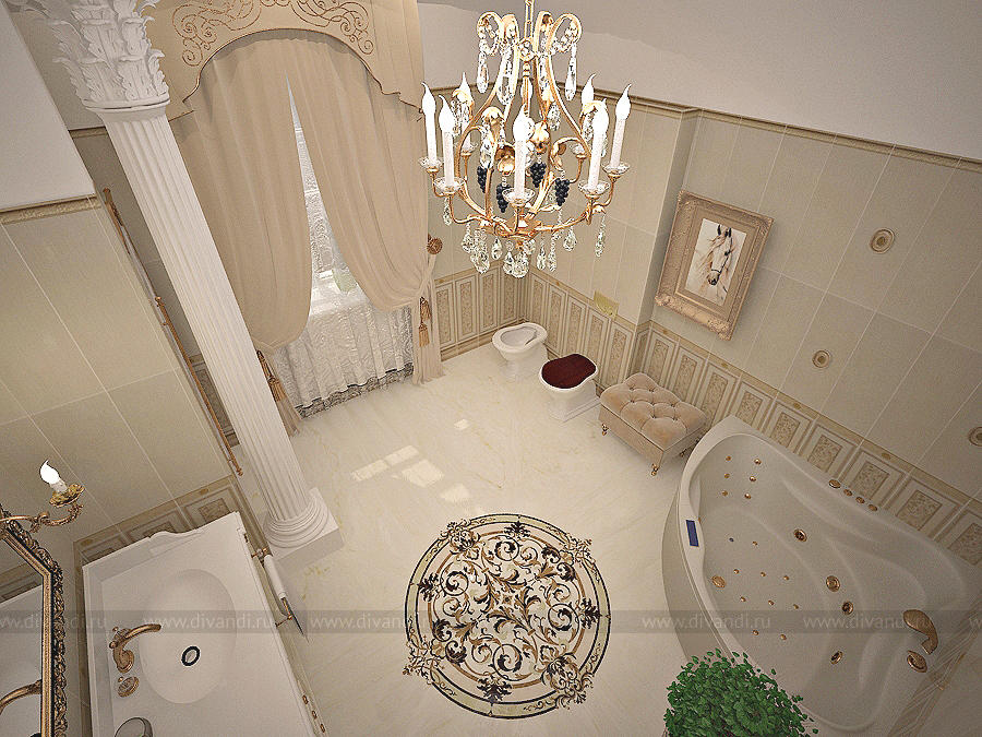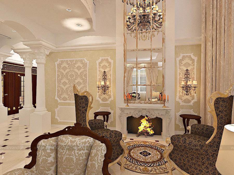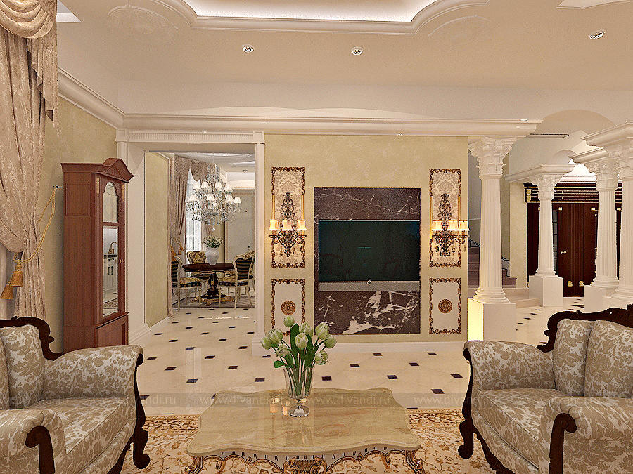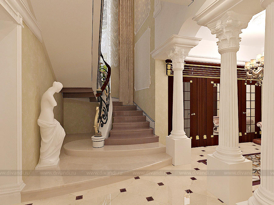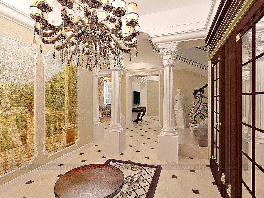 В проект включены почти все элементы классического стиля: симметрия, колонны, бордюры и карнизы, статуя Венеры Милосской, резной камин из камня, разнообразие богатых фактур тканей, фреска в холле. Несмотря на их множество интерьер не перегружен элементами.