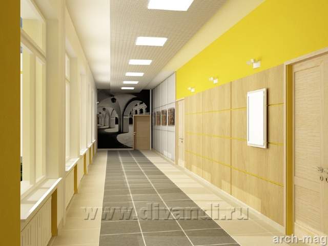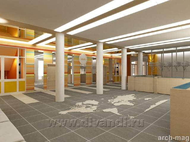 Интерьер колледжа оформлен в современном стиле, способствующем развитию творческого начала в юных детских умах. В дизайне интерьера используется теплая гамма цветов - оранжевый, желтый и зеленый.