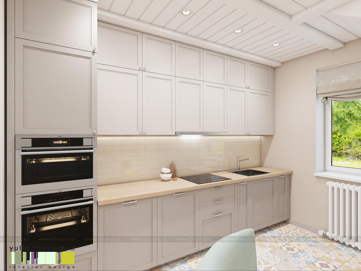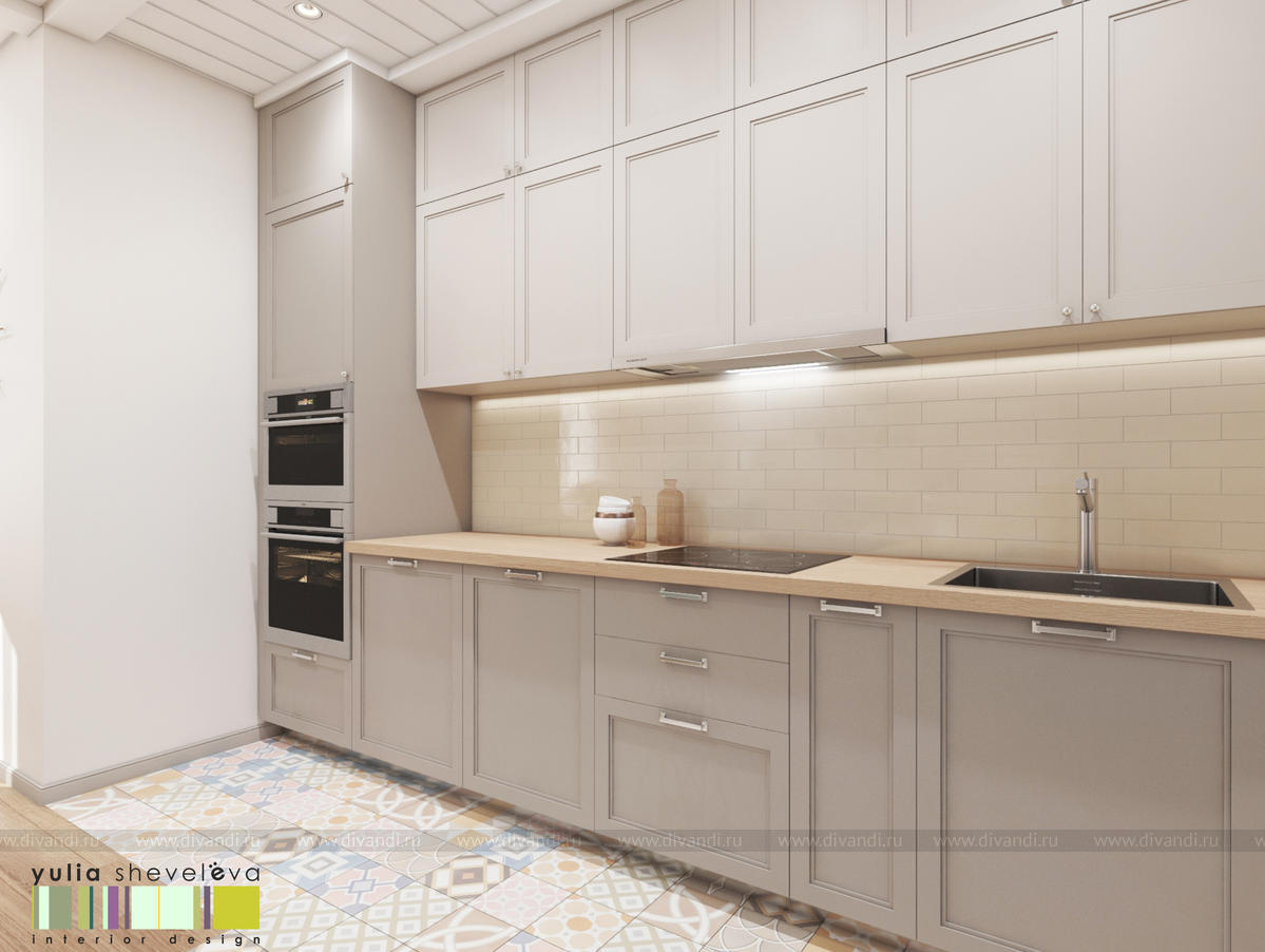 Кухня выполнена в светлых тонах и в легком классическом стиле, а на полу размещена очень интересная плитка разных оттенков.