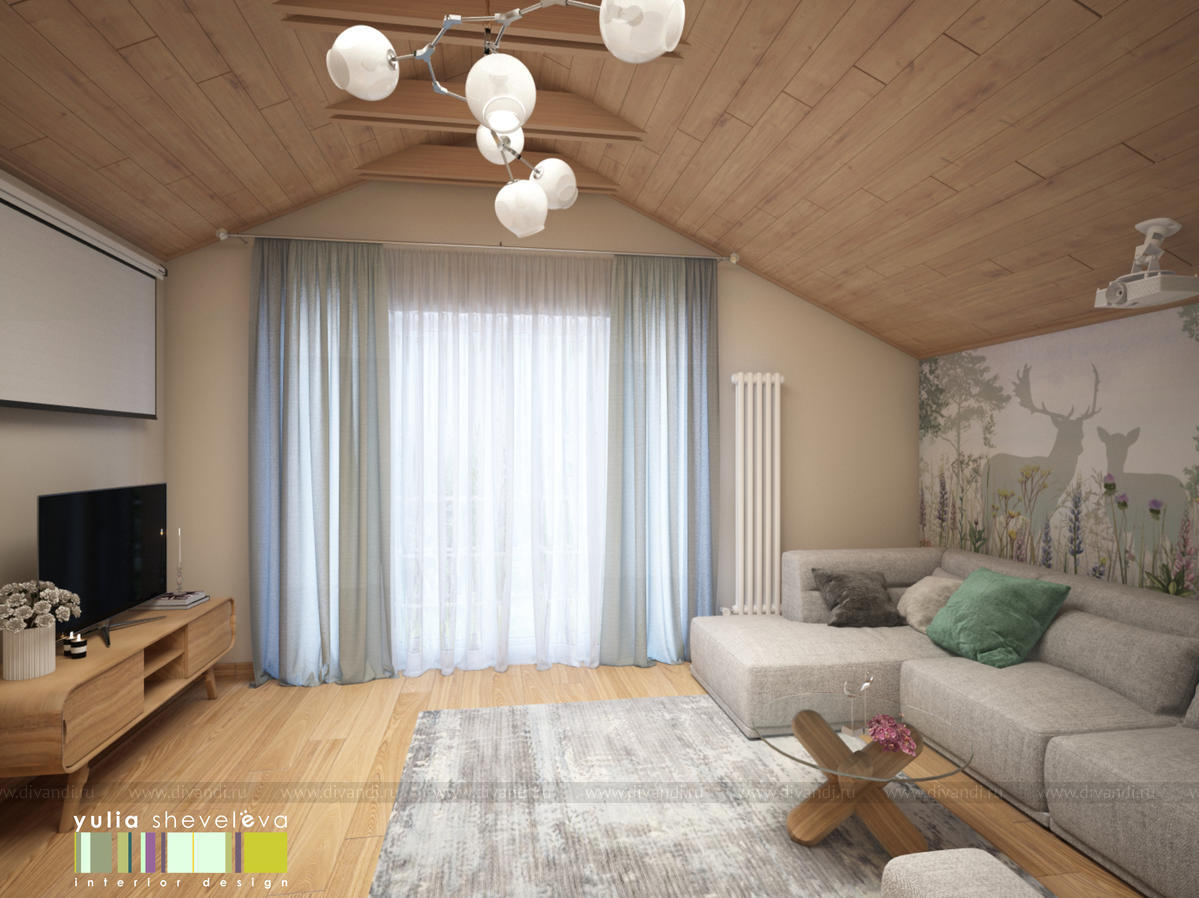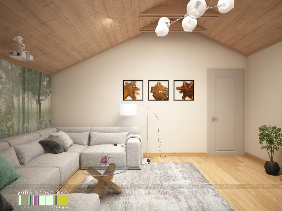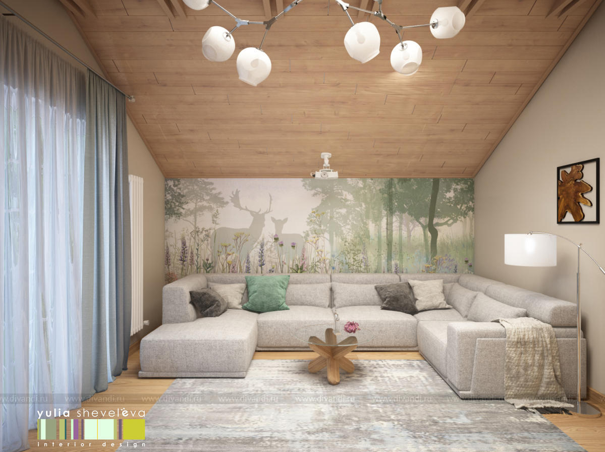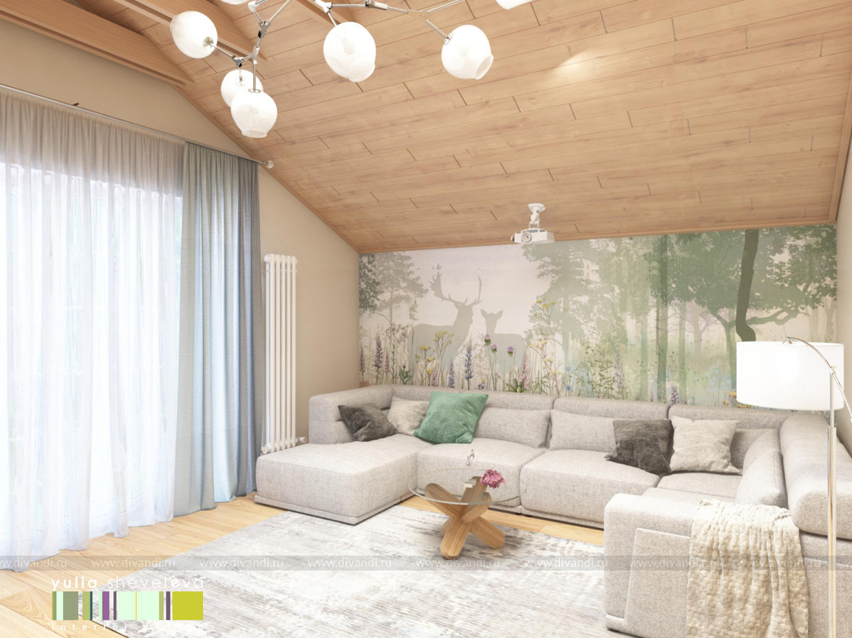 На втором этаже – гостиная и спальная комната. В гостиной вместительный и очень удобный диван, где может разместиться много гостей. За ним фреска с природным рисунком, которая является еще одним пазлом уютного интерьера с элементами эко-стиля.