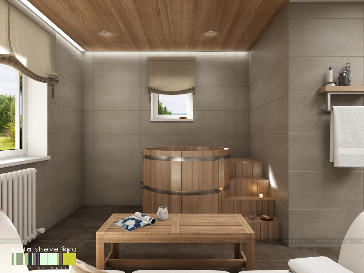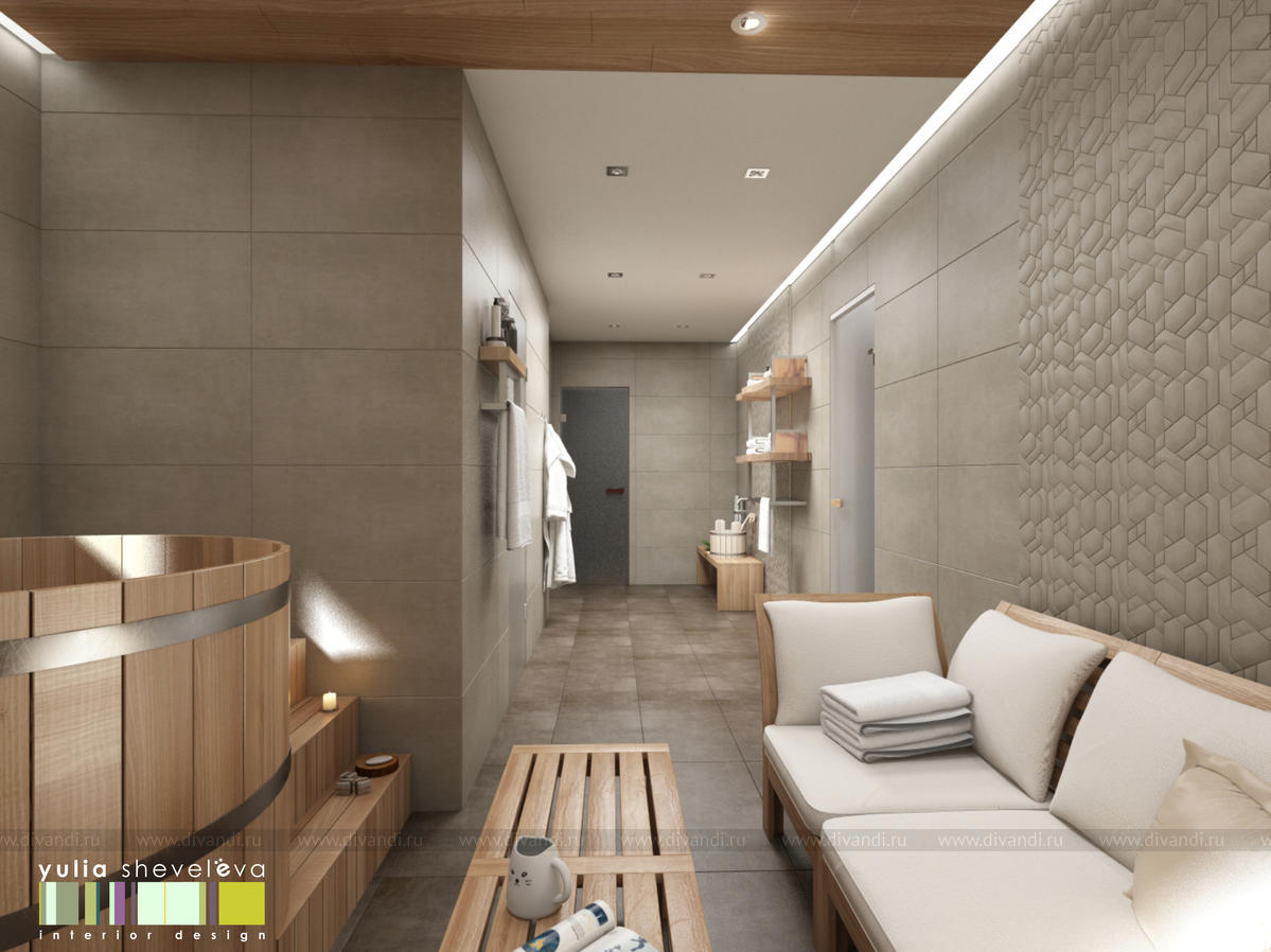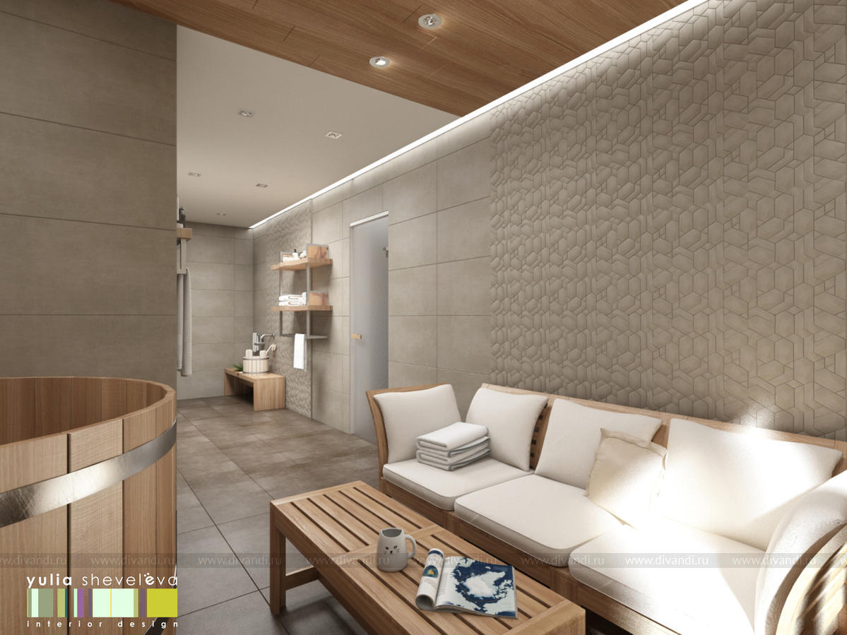 В спа-зоне спроектирована сауна, купель, санузел и места для отдыха.