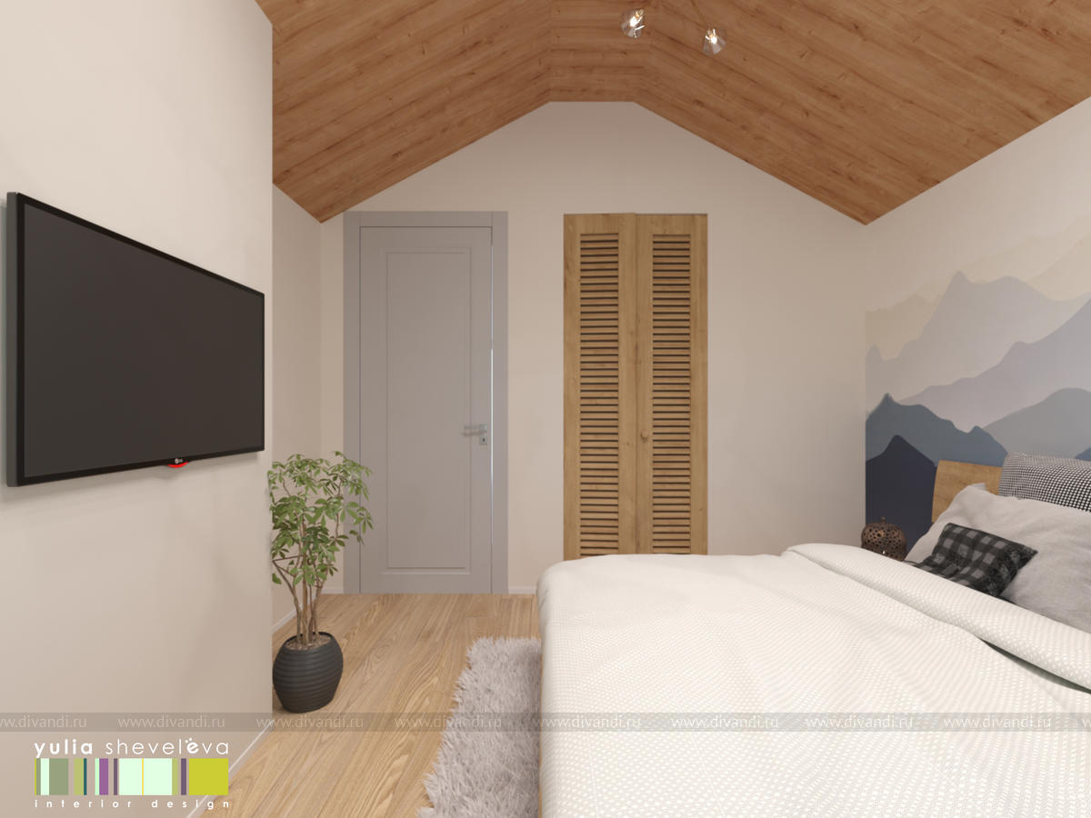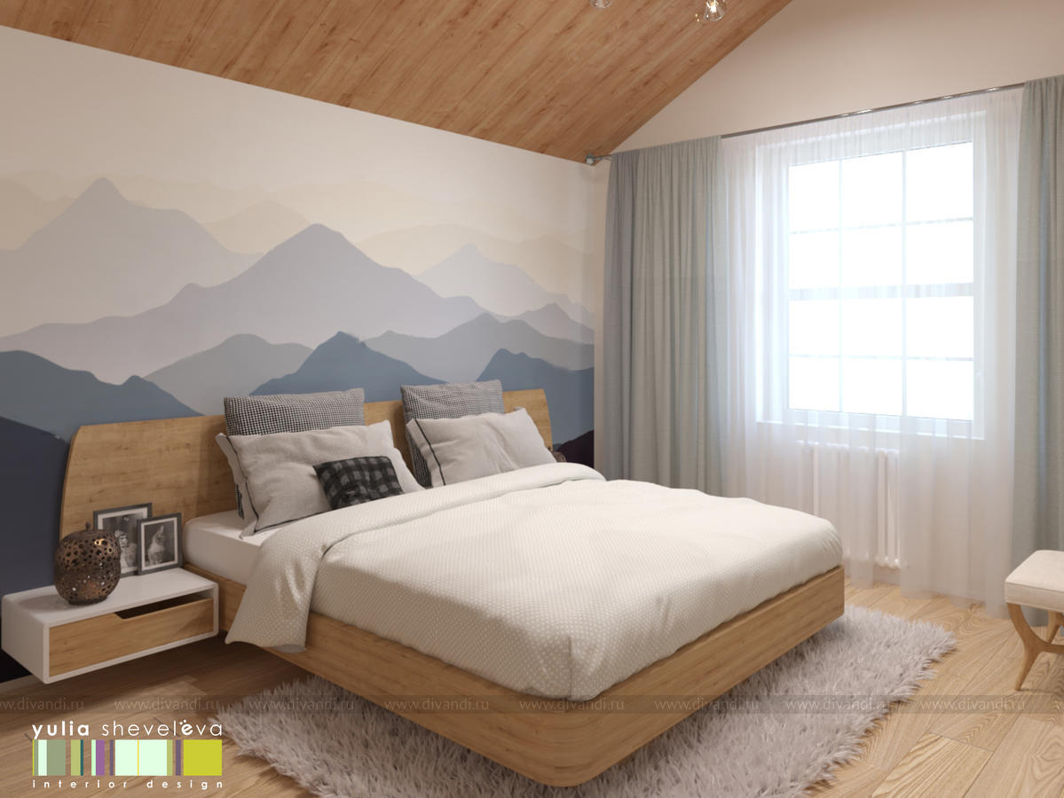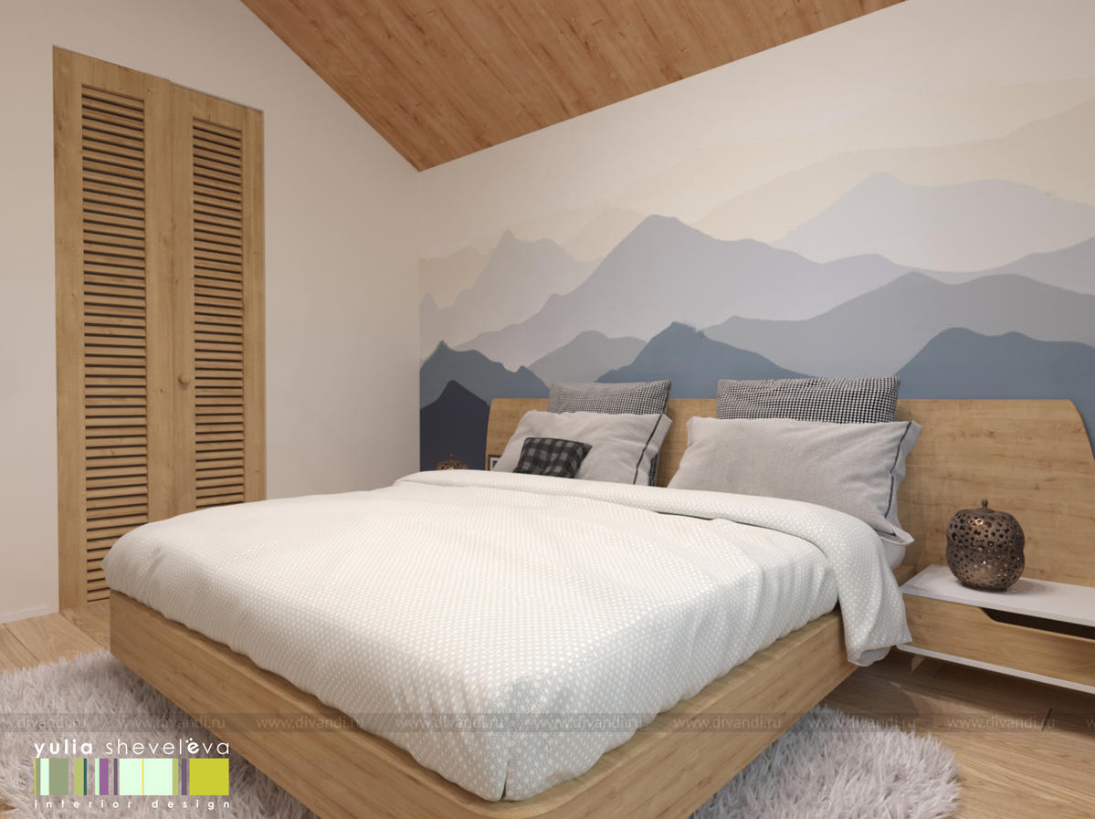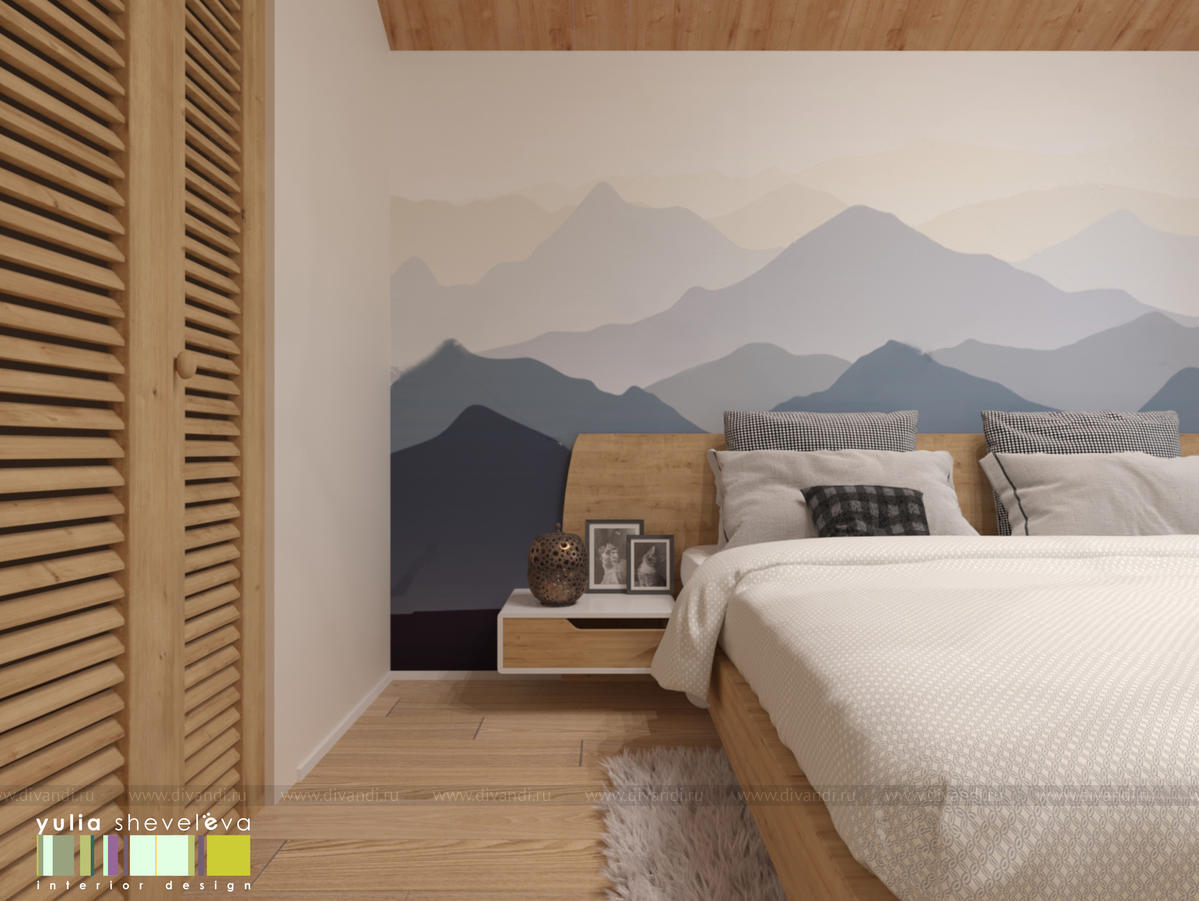В спальне эко-стиль еще больше набирает силу – вся мебель выполнена из дерева специально для этого проекта. Сине-серый рисунок за изголовьем кровати создает легкую атмосферу прохлады в интерьере.