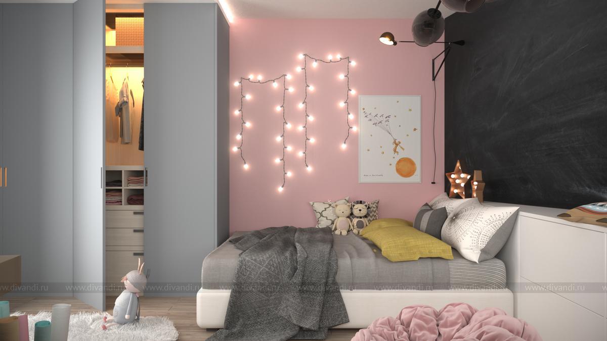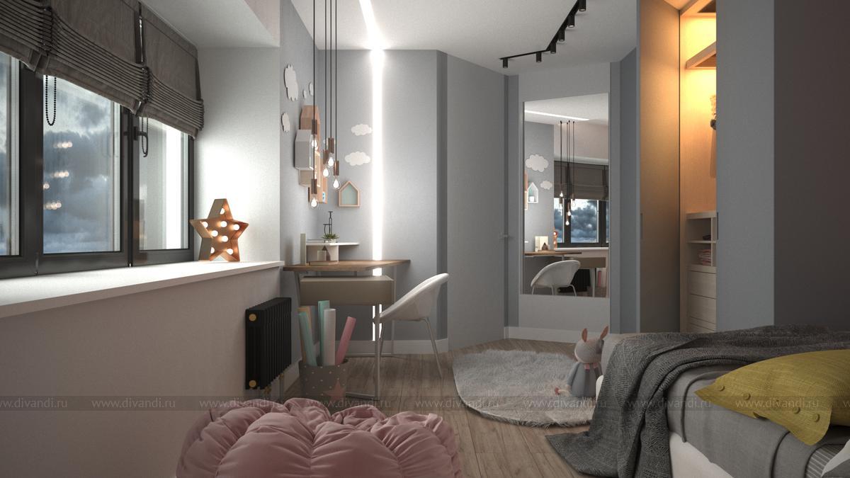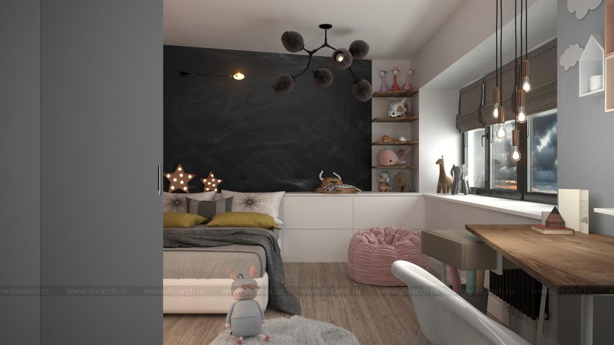 Интерьер детской проектируется на 5-7 лет вперед. Поэтому здесь сочетаются подростковые элементы мебели с детскими игрушками и пространством, в котором можно творить и менять свою комнату на свой вкус...