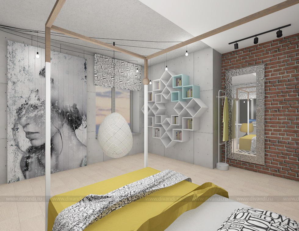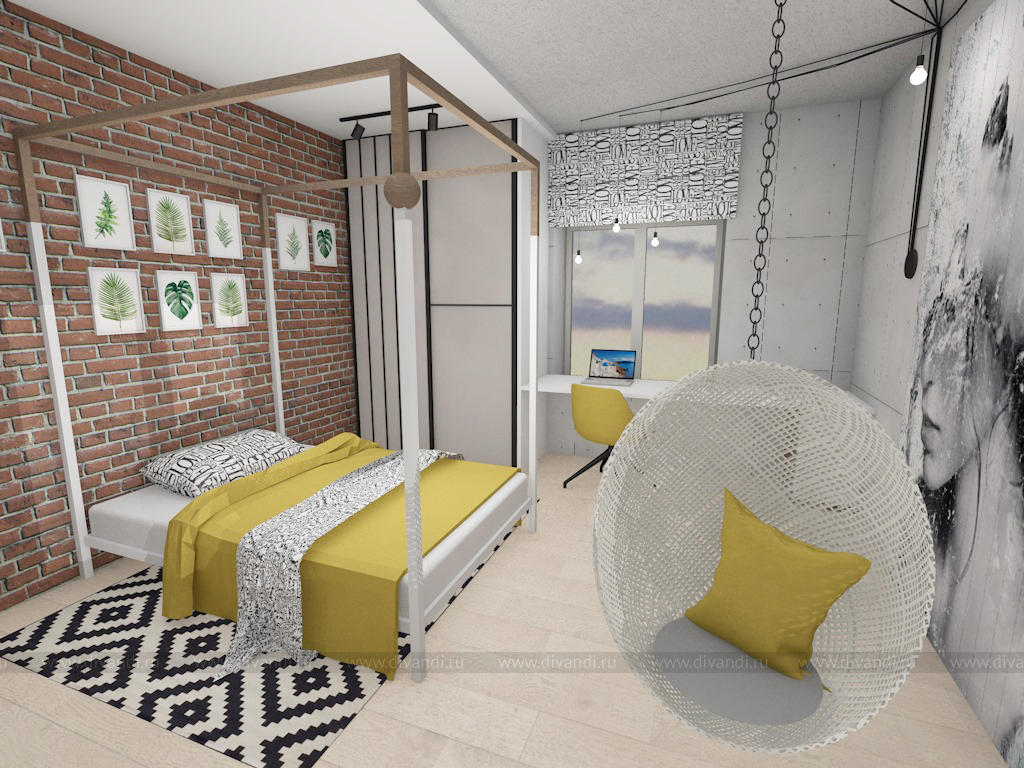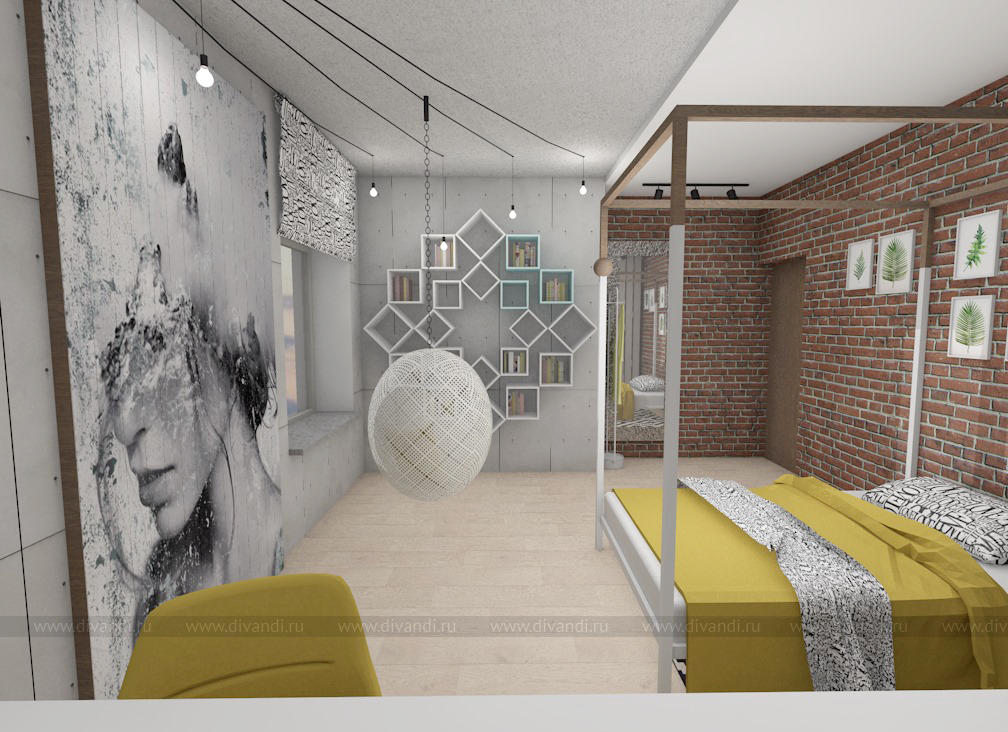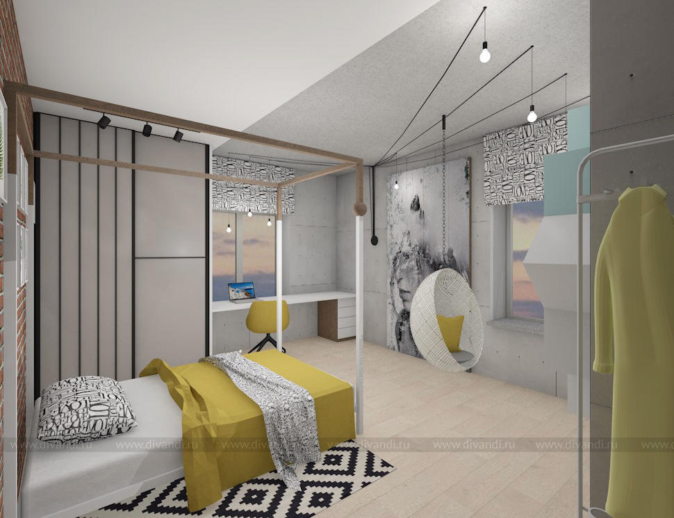 Комната для девушки разделена на несколько зон разными фактурами и цветом. В зоне отдыха расположены полки в виде цветка и подвесное кресло, в рабочей зоне - вместительный стол с ящиками. Каркас кровати в зависимости от настроения хозяйки можно украсит занавесками или светящимися гирляндами. Современное мобильное освещение придает комнате динамичный характер)