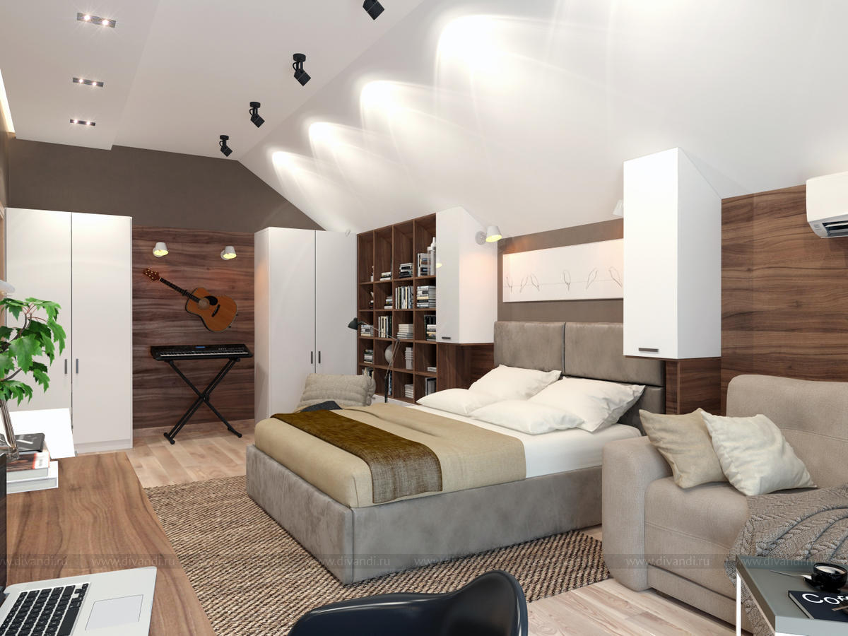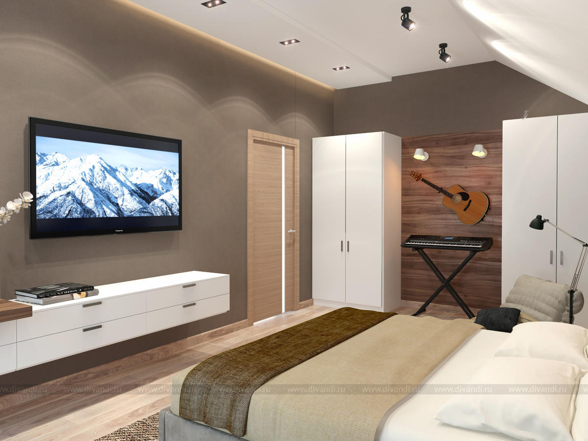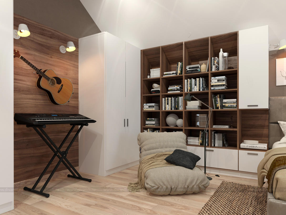 Проект комната для молодой девушки , занимающейся музыкой. Выполнена в спокойных бежевых тонах.