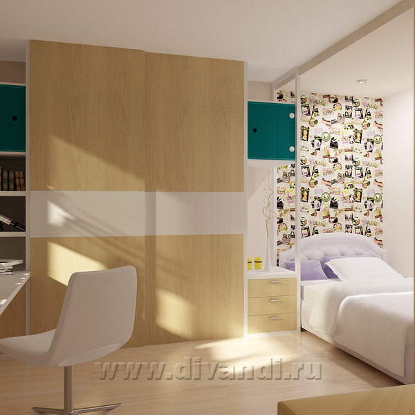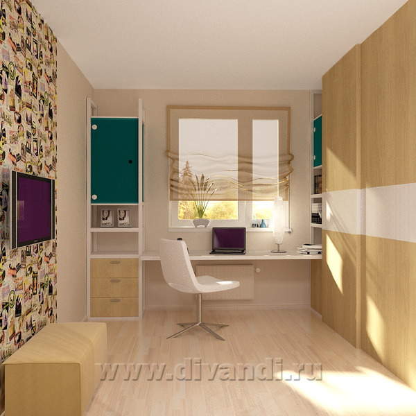 Интерьер комнаты для подростка требует особого подхода. В это время с 11 до 17 лет, и мальчики и девочки нуждаются в собственном замкнутом пространстве в доме. Поэтому очень важно создать подростку свою комнату с правильной атмосферой! В нашем случае, мы постарались вписать в небольшое помещение 15м.кв. три важных зоны. Это рабочая зона, зона отдыха и гардеробная. Таким образом ребенок может проводить в своей комнате большую часть времени, наслаждаясь самостоятельностью. Несмотря на объединение трех зон в комнате нет нагромождения, благодаря грамотной планировке. А основной светлый тон помещения не раздражает глаз. Яркие акценты в виде обоев и мебельных модулей вносят задор в общее цветовое решение. Комната получилась в меру современной, светлой и комфортной.