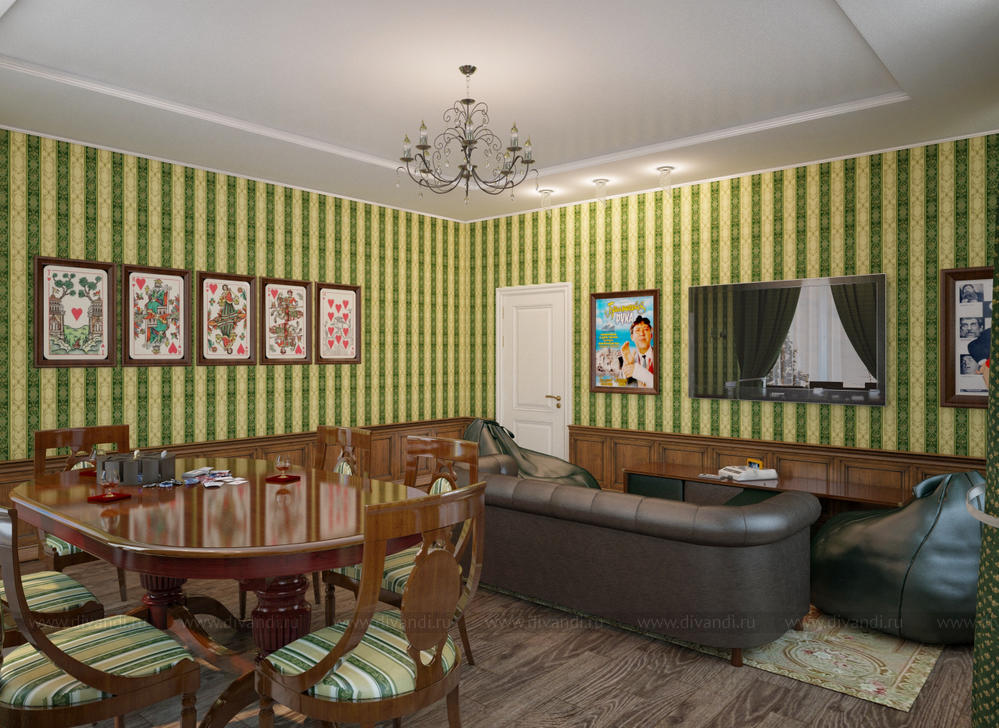Комната для отдыха,игр и просмотра фильмов в загородном доме выполнена в классическом стиле.