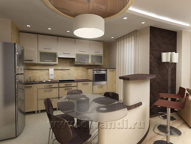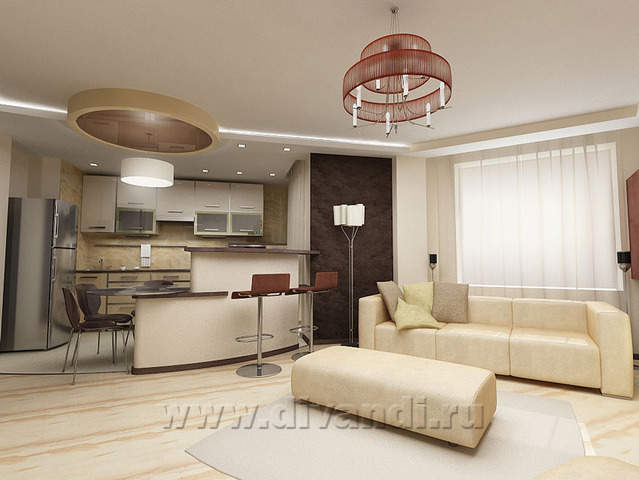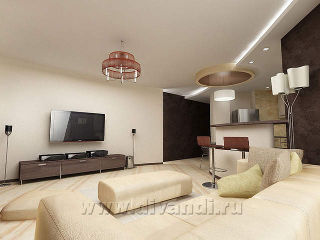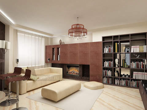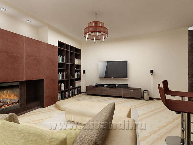 Дизайн современной гостиной. Минималистичный интерьер выполнен дизайнерами студии "Малина" в смелой западной форме. В небольшой гостиной появился камин. Конструкция камина как будто встроена в стену. На самом деле весь коричневый объем - это навесные шкафы. В комнате имеется несколько выступающих колонн, которые дизайнеры обыграли таким нестандартным образом. Интересно решена барная стойка, разделяющая два помещения. Интерьер "светится" за счет хорошей отражающей способности светлого пола.
