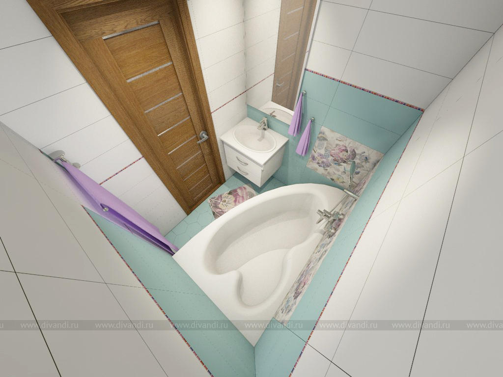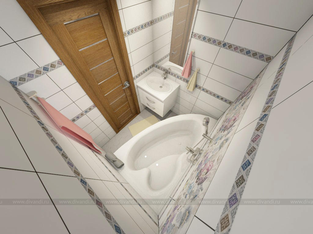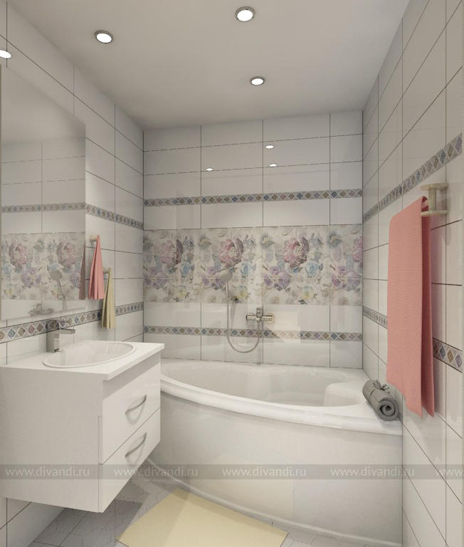 Проект небольшой ванной комнаты решен на сочетании белого фона и красивых декоров с стилизованными акварельными цветами.