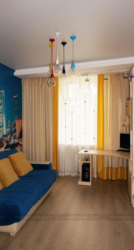 Комната для подростка решена на контрасте синего и желтого. Изюминку интерьеру придают современные итальянские светильники и нестандартная мебель, выполненная на заказ.