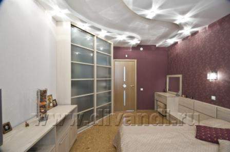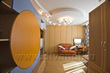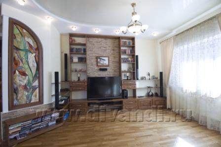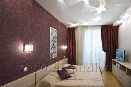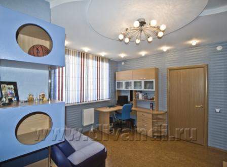 Спальня родителей, расположенная между двумя детскими, имеет прямоугольную форму. В композиционном решении помещения доминируют прямые линии. Колористическое решение базируется на соотношении темно-бордовый / светло – бежевый. Мебель выполнена из массива сосны, тонированного и покрытого матовым лаком.