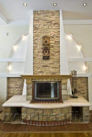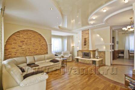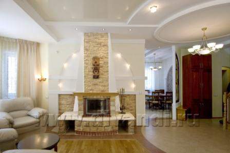 Гостиную можно условно разделить на две функционально разные зоны. Обе они предназначены для отдыха. Смысловым центром одной из них является камин, а другой – телевизор.