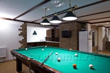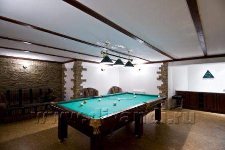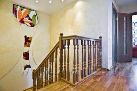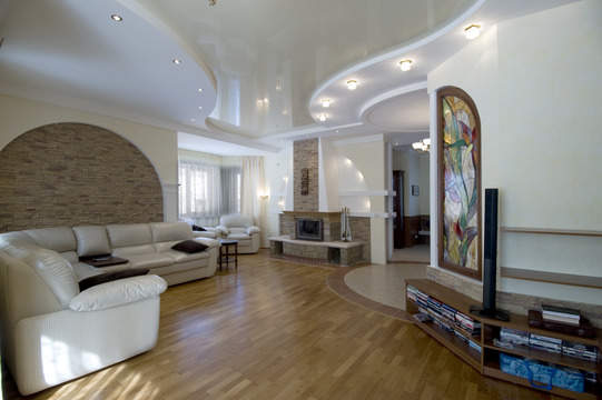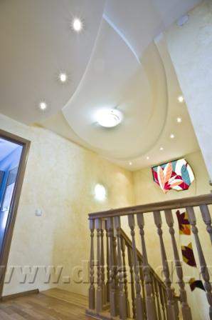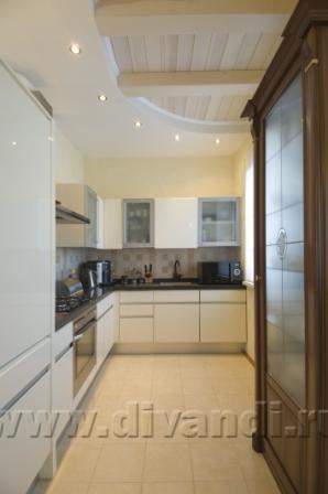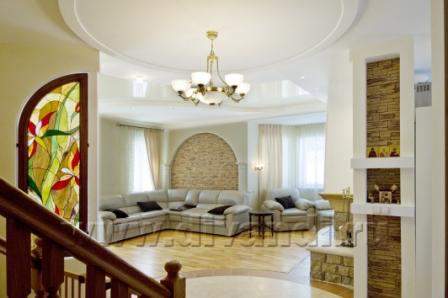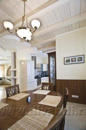 В кухне – столовой соединились классические и современные элементы: обеденная зона из массива ореха, а напротив – глянцевый бежево - сливочный кухонный гарнитур. Функциональное зонирование подчеркнуто композицией плоскостей потолка и пола. Над обеденным столом расположены тонированные массивные деревянные балки, «поддерживающие» досчатый потолок, а над зоной кухонного гарнитура, изогнутый по лекальной кривой – опуск из гипсокартона.
