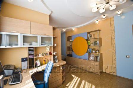 Детская для дочки на втором этаже, выполнена в оригинальной цветовой гамме: оранжевый – голубой. Мебель спроектирована с учетом индивидуальных потребностей, элементы фасадов поддерживают общее колористическое и композиционное решение интерьера.