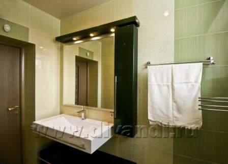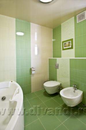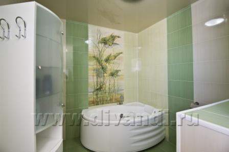 Ванная комната решена в оттенках зеленого. Над объемной угловой ванной расположено красивое панно с растительными мотивами.