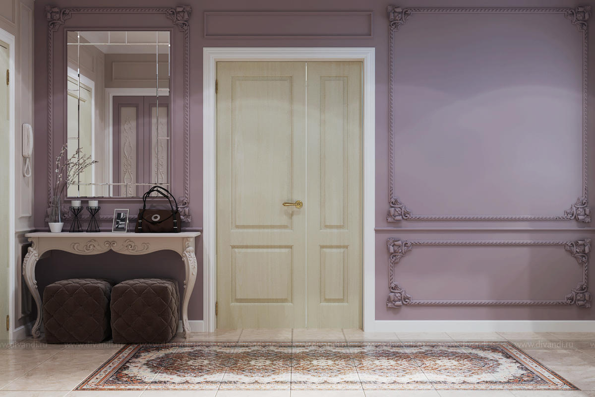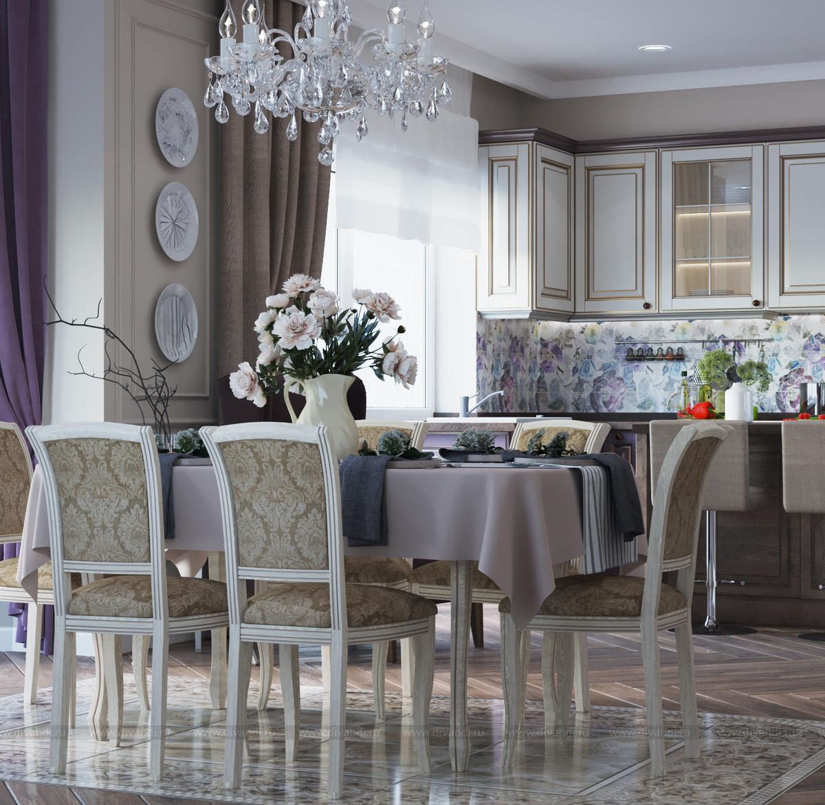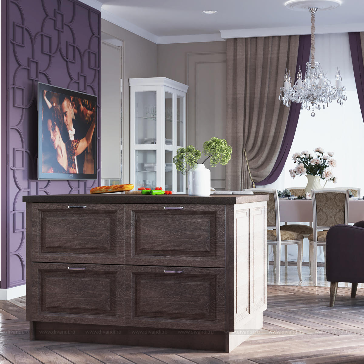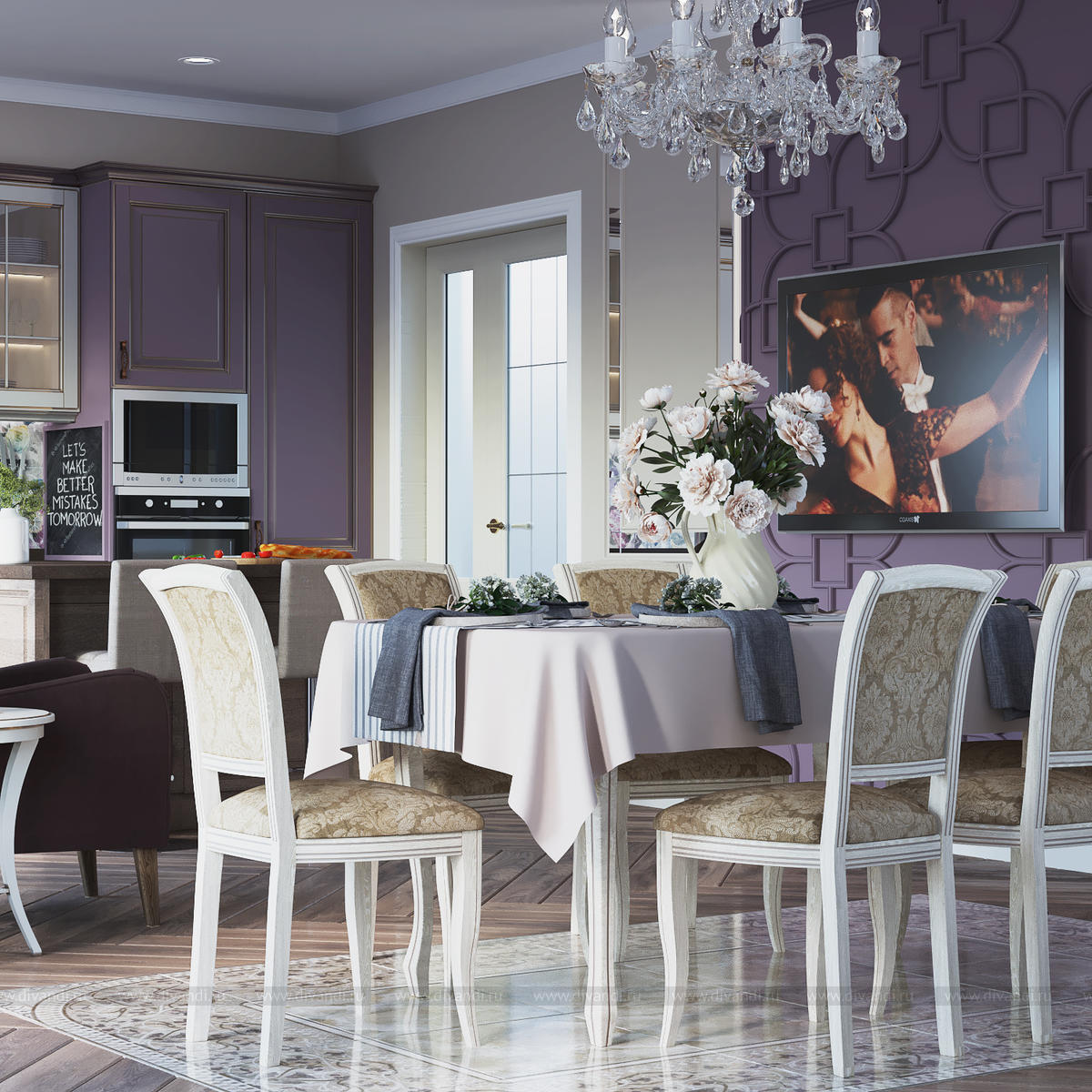 Кухня-столовая и прихожая решены в классическом стиле. Цветовым решением стал спокойный бежевый тон с акцентным фиолетовым. На кухне стена с телевизором выделена в виде панно из лепнины с подсветкой, а также в рамках из молдинга вставлены зеркала. Фиолетовый тон поддержан в фасадах кухни с патиной и в резной двери в прихожей. За этой дверью скрывается вместительная гардеробная. Очень долго думали, как обыграть ее и остановились на концепции двери в «Нарнию».