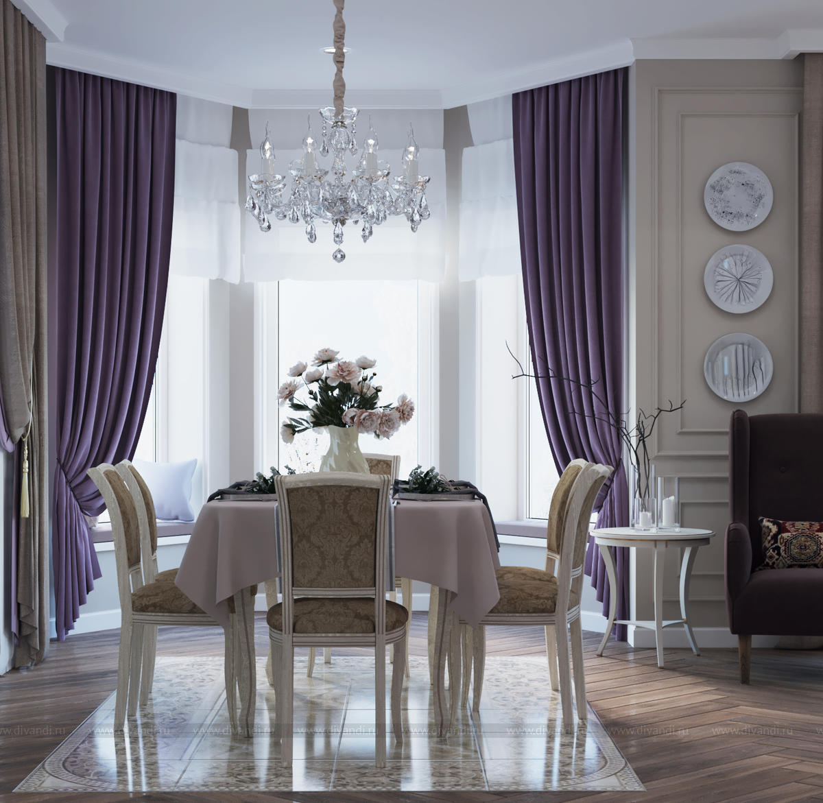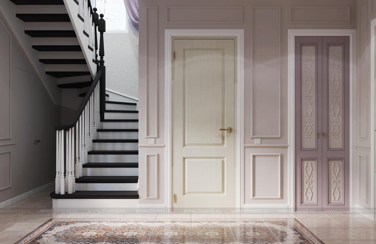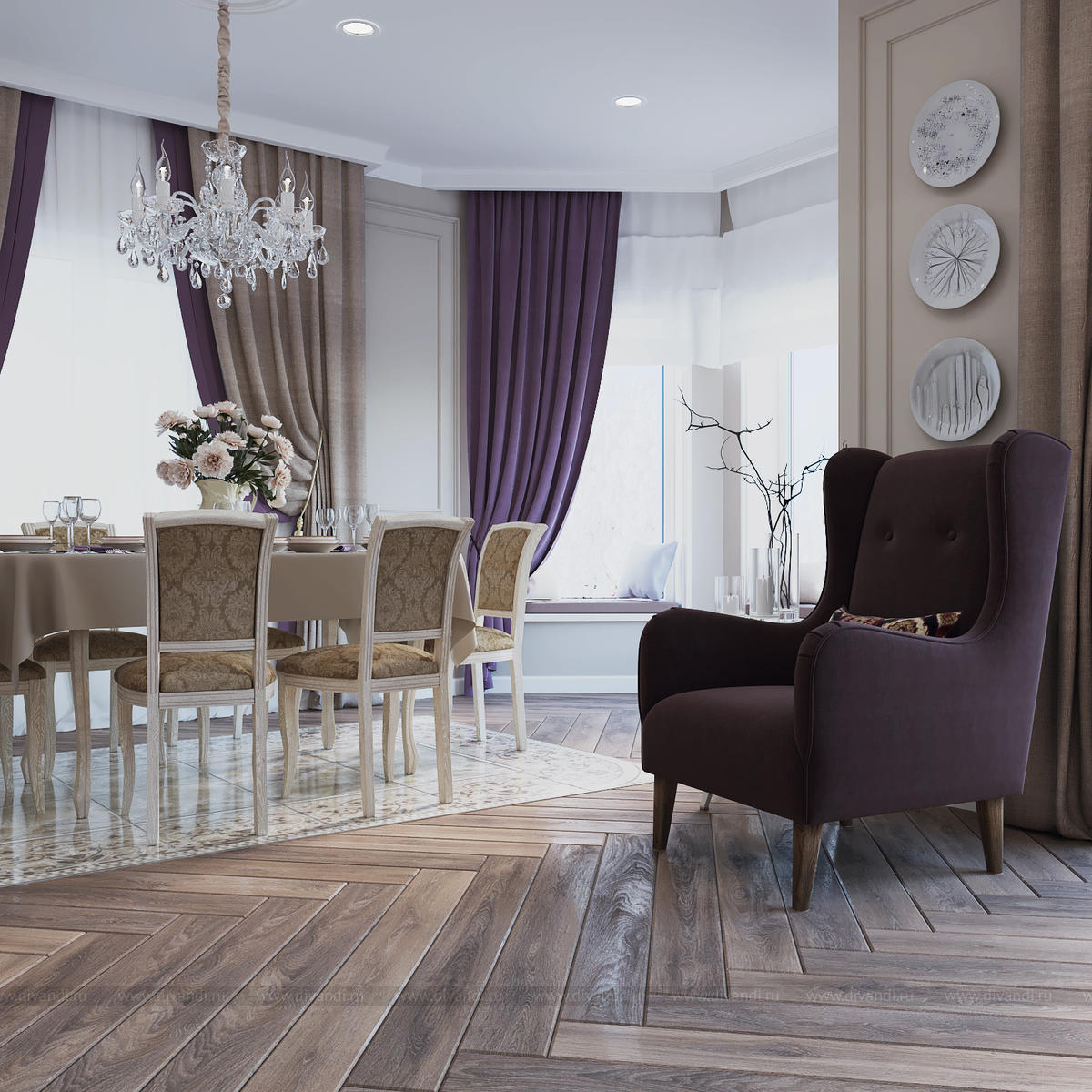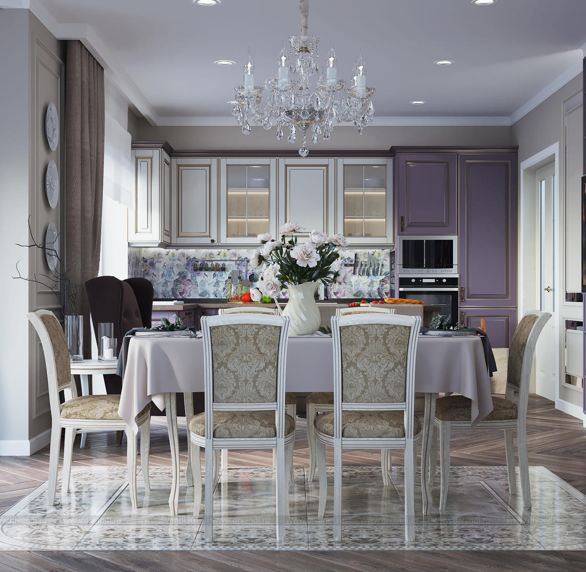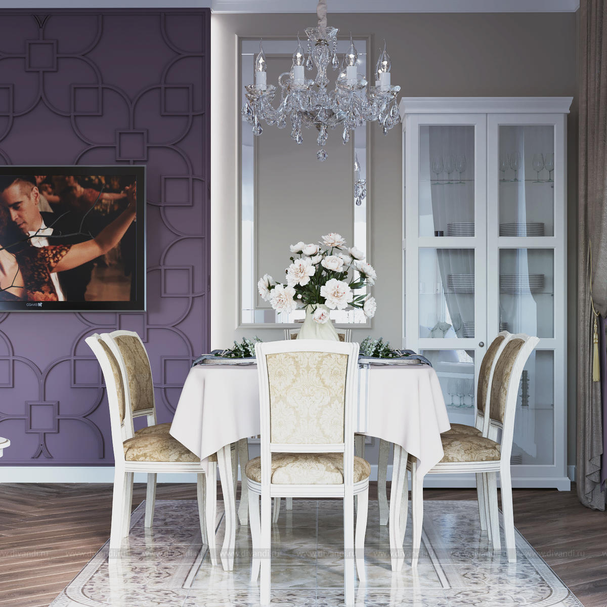 Кухня-столовая и прихожая решены в классическом стиле. Цветовым решением стал спокойный бежевый тон с акцентным фиолетовым. На кухне стена с телевизором выделена в виде панно из лепнины с подсветкой, а также в рамках из молдинга вставлены зеркала. Фиолетовый тон поддержан в фасадах кухни с патиной и в резной двери в прихожей. За этой дверью скрывается вместительная гардеробная. Очень долго думали, как обыграть ее и остановились на концепции двери в «Нарнию».
