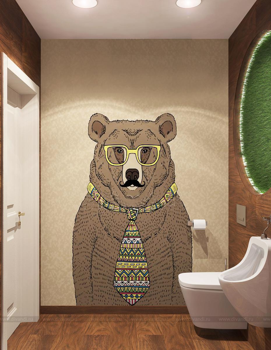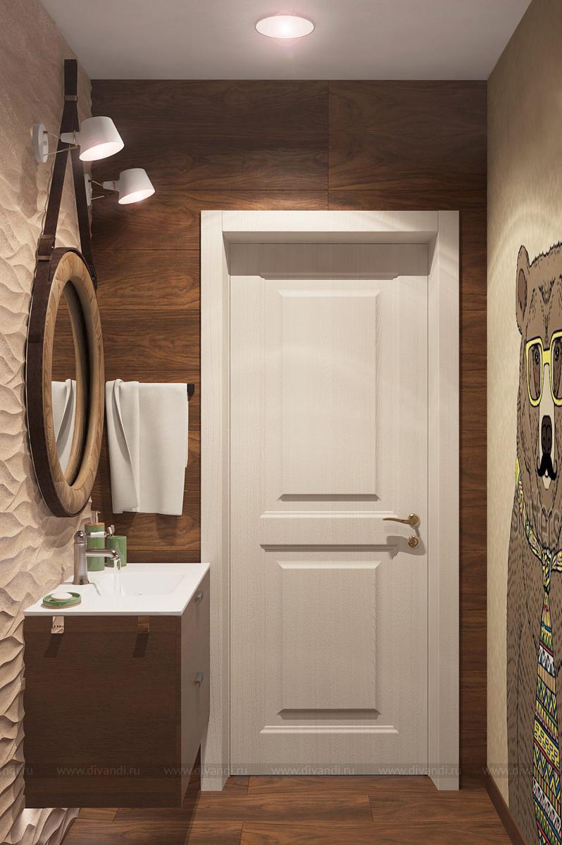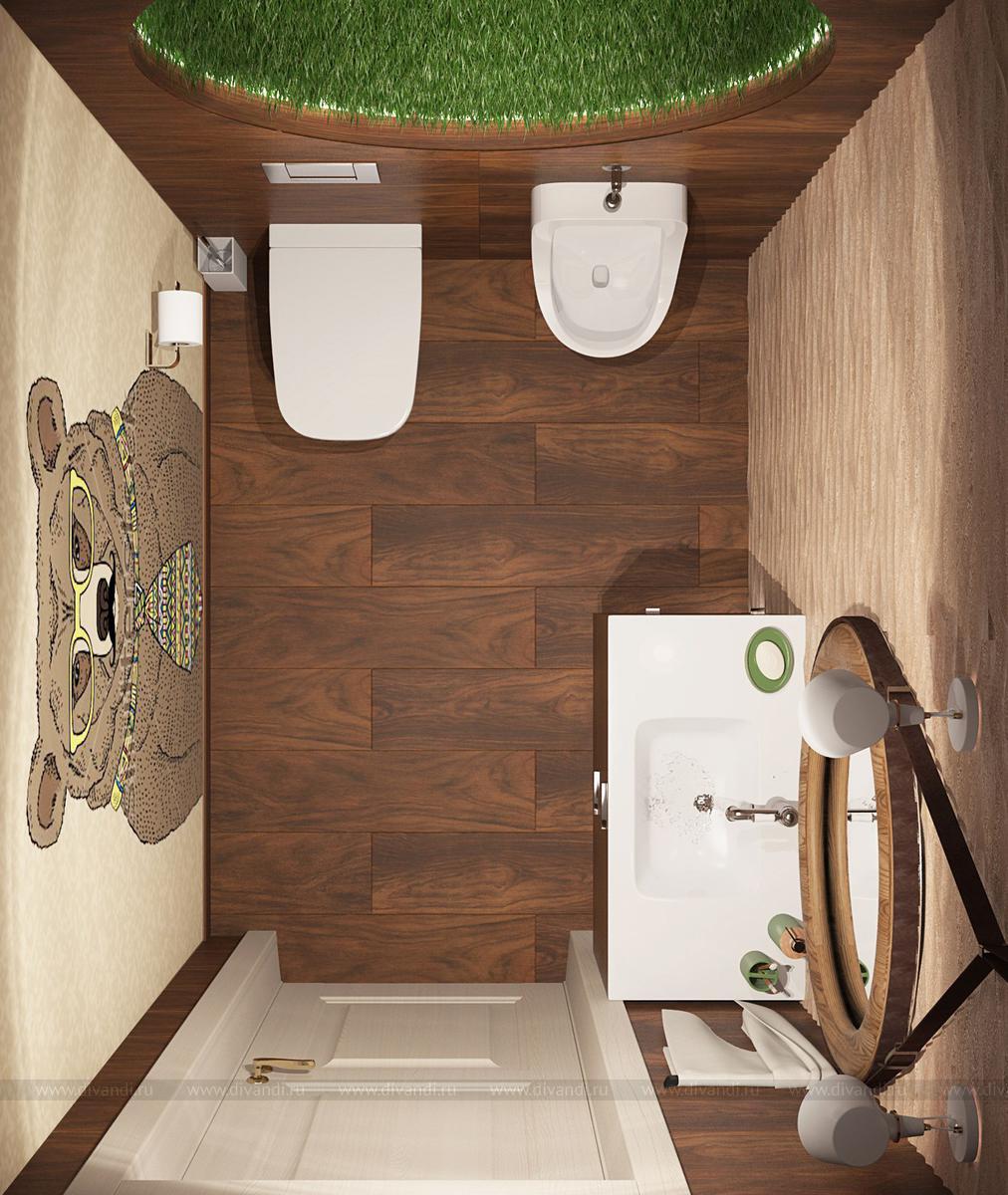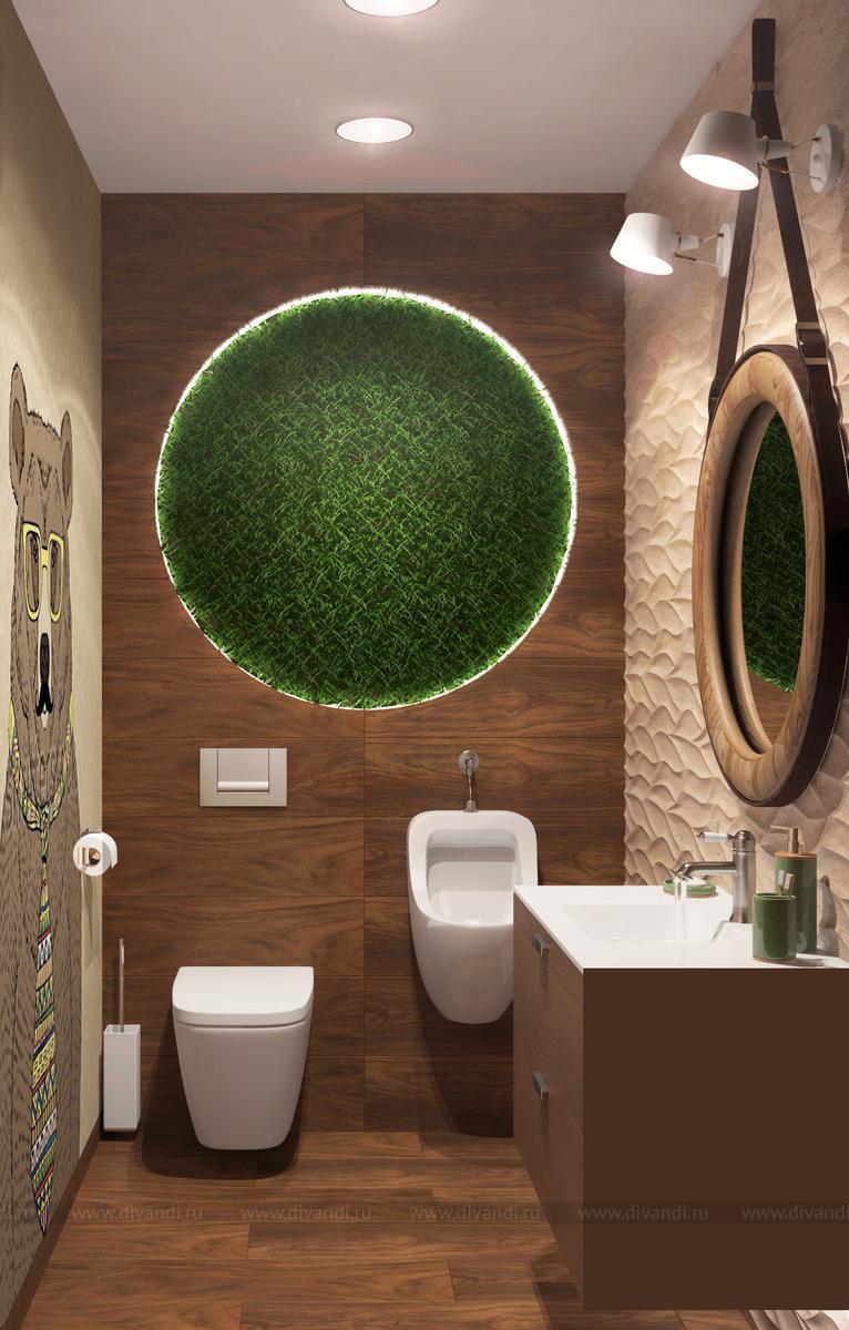 В санузле хотелось чего-то необычного в современном стиле. И нам это удалось: нет стандартной прямоугольной формы для полочек, за «фито кругом» скрываются коммуникации и небольшое дополнительное место хранения.