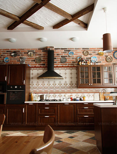 Материалы, применяемые в этом интерьере: ковка, натуральное дерево, камень. Керамогранит на полу имитирует деревянные полы, под ним теплый пол.