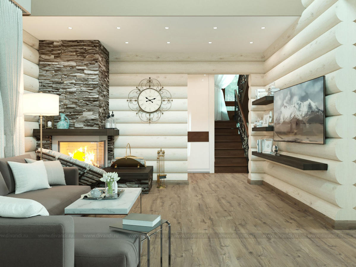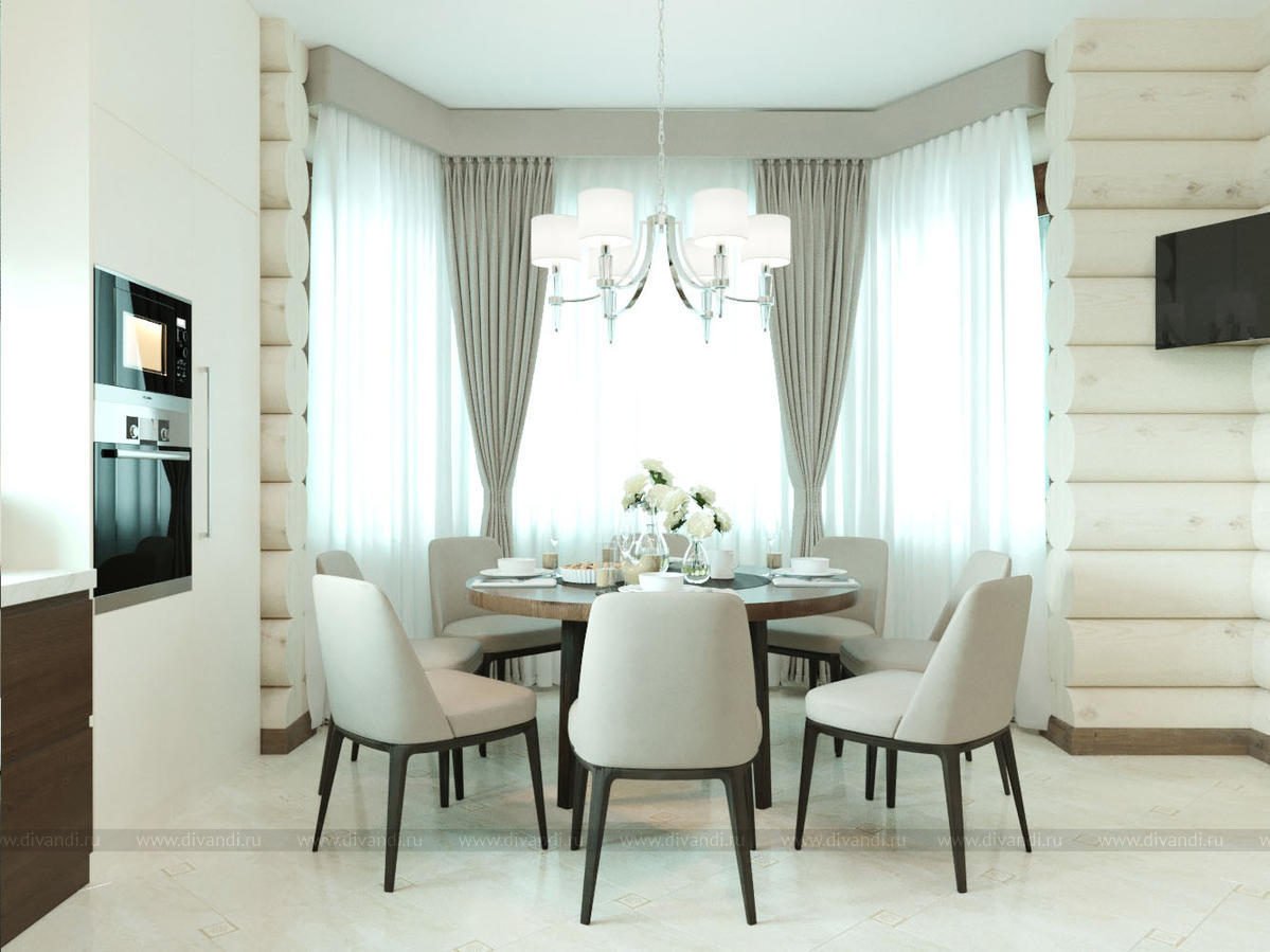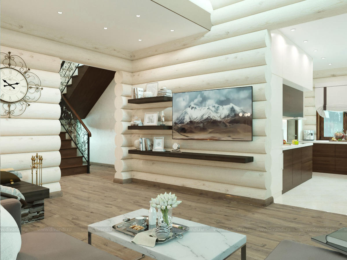 Коттедж из бруса в светлых оттенках. Весь коттедж выполнен в современном стиле с добавлением современной классики.